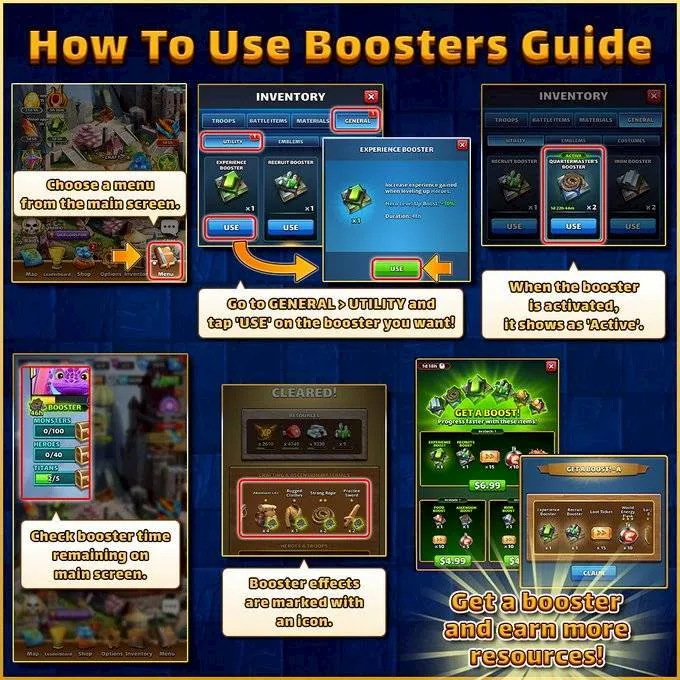 14. This post is a master discussion & information thread for the Boosters and Decrees added to Empires and Puzzles in Version 76 Boosters The previous name of the Boosters were Harversters, and Path of Valor has given them as reward. Experience Booster (48h) Increase experience gained when leveling up Heroes. Hero Level Up Boost: +10% Recruit Booster (48h) Get more Recruit from Story Map Stages. Recruits: +150% If your Recruits storage capacity is full, you will receive Recruit Decrees Quartermaster’s Booster (48h) Increases the chance of finding specific ascension items from Story Map Stages. Advanturer’s Kit: +150% Strong Rope: +150% Practice Sword: +150% Rugged Clothes: +150% Omnia Booster (48h) Get more Food, Iron, Recruits, Items from Story Map Stages. Food: +150% Iron: +150% Ascension & Crafting Items: +50% Recruits: +50% If your Recruits storage capacity is full, you will receive Recruit Decrees. Food Booster (48h) Get more Food from Story Map Stages. Food: +300% Iron Booster (48h) Get more Iron from Story Map Stages. Iron +300% Alchemist’s Booster(48h) Increases the chance of finding specific crafing items from Story Map Stages. Grimore Dust: +150% Midnight Roots: +150% Orichalcum Nugget: +150% Dragon Bone: +150% Meteor Fragments: +150% How to use them ? Boosts can be activated either by clicking “Use” in your inventory or selecting the boost icon beneath your avatar. When inactive, a boost appears grayed out in the list under Blackened Cataract. Once activated, its infographic becomes fully visible, displaying the remaining duration. Since version V80, multiple boosters can now be activated simultaneously. Additional boost rewards are highlighted with a green outline. Recuit Decrees These are resource bundles for Recruits. (Large) Recruit Decree Insantly gain 100 Recruits. (Medium) Recruit Decree Insantly gain 50 Recruits. (Small) Recruit Decree Insantly gain 10 Recruits. Decree creation is possible with the Recruit Booster and the Omnia Booster. Decree creation is limited to 100 recruits per day and triggers automatically when the recruit gauge is full. The number of recruits gathered per level determines how many decrees are issued. If fewer than 50 recruits are collected at once, Decree 10 will handle the creation.