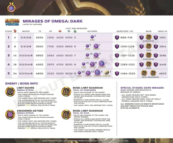 13. These quests are the main event for obtaining Aethers, the materials needed to surpass the heroes' stat limit and add two additional tiers of advancement. Find theLimit Break guide here : [PLACEHOLDER] 1. General Quest Structure Frequency: Every 28 days Duration: 36 hours. Focus: The quest is always focused on a single element. Rotation Quest : Fire > Holy > Nature > Ice > Dark Progression: The quest features 5 stages with increasing World Energy (WE) costs and enemy waves. 2. Stage Details A. Stage Details (Cost and Waves) Stage 1: 4 WE, 4 Waves. Suggested Power: 2500. Bosses: Type 1 + 2 Mobs. Stage 2: 9 WE, 4 Waves. Suggested Power: 3500. Bosses: Type 2 + 2 Mobs. Stage 3: 14 WE, 5 Waves. Suggested Power: 3900. Bosses: Type 1 + 2 Mobs. Stage 4: 19 WE, 5 Waves. Suggested Power: 4300. Bosses: Type 2 + 2 Mobs. Stage 5: 24 WE, 5 Waves. Suggested Power: 4800. Bosses: Type 1 + 2 Mobs. B. Specific Effects per Element (Enemies) The ailments applied by the Mobs' Omega Strike and the Bosses' Skills depend on the quest element. Trial of Fire Quest: Mobs (Omega Strike): Apply Burn damage and -60% Mana generation. Boss Type 1 (Single Target): Applies Burn damage. Boss Type 2 (Area): Applies -8% Mana generation (undispellable) to the area. Trial of Ice Quest: Mobs (Omega Strike): Apply -75% reduced Healing received and -60% Defense. Boss Type 1 (Single Target): Applies -60% Defense. Boss Type 2 (Area): Applies -75% reduced Healing received (undispellable) to the area. Trial of Holy Quest: Mobs (Omega Strike): Apply -21% Accuracy (applies to offensive Special Skills) and -60% Defense. Boss Type 1 (Single Target): Applies -60% Defense. Boss Type 2 (Area): Applies -19% Accuracy (offensive Special Skills) to the area. Trial of Nature Quest: Mobs (Omega Strike): Apply -60% Attack and -60% Mana generation. Boss Type 1 (Single Target): Applies -60% Mana generation. Boss Type 2 (Area): Applies -60% Attack to the area. Trial of Dark Quest: Mobs (Omega Strike): Apply Poison damage and -60% Defense. Boss Type 1 (Single Target): Applies -60% Defense. Boss Type 2 (Area): Applies Poison damage (490 over 5 turns) to the area. C. Special Rules per Element (Hero Buffs) Note: All enemies have an innate resistance to status ailments. Fire: Every 5 turns, Fire Heroes receive +50% Attack and Counterattack with 20% of damage received (5 turns). Ice: Every 5 turns, Ice Heroes receive +75% power for Special Skills (SS) and Share damage received (5 turns). Holy: Every 5 turns, Holy Heroes receive +50% Mana generation and 25% chance to Dodge Special Attacks (5 turns). Nature: Every 5 turns, Nature Heroes receive +25% increased Healing received and Regenerate 120 HP (over 5 turns). Dark: Every 5 turns, Dark Heroes receive +50% Mana generation and Heal 100% of damage dealt from normal attacks (5 turns). 3. Quest Rewards (Limit Breaker - L.B. Aethers) The rewards increase in quantity and rarity as you progress: Stage 1: 2x Rare L.B. Stage 2: 5x Rare L.B., 1x Epic L.B. Stage 3: 10x Rare L.B., 3x Epic L.B. Stage 4: 15x Rare L.B., 8x Epic L.B., 1x Legendary L.B. Stage 5: 20x Rare L.B., 12x Epic L.B., 3x Legendary L.B., 1x Alpha Aether. 4. Resources Guide by BirksG (EN) Guide by BirksG (JP) Guide by Zartanis Old guide by Cap (alpha aether missing) Omega Quest 2026 Credit by MissK