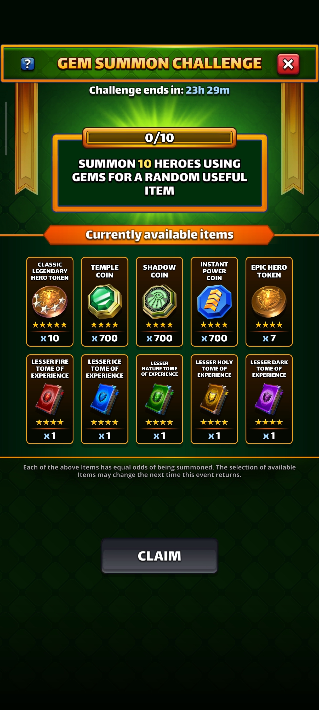25. This is new summon chalenge where you can get a guaranteed legendary hero after a certain amount of gem summons. Summon Heroes using Gems to summon a random Legendary Hero from currently avaiable Heroes. Daily Summons, Mystic Summons and extra bonus draw don't grant progress in the Gem Summon Challenge. 1. Apperarance Rates Legendary Hero: 100.0% EachHeroes have equal odds of being summoned. The selection of available Heroes may change the next time this event returns. You need to do X gem summons in event portals. (X can be different for different occurences.) There is a progress bar visible about your performed summon in the summon challenge screen and on the summon screen. Once you have performed these many heroes, then you need to click on Claim button get your random Legendary hero. Once you claimed you hero, then the summon challenge closes until the next occurence. 2. History of past gem summons Occurrence / Summons needed / Offered heroes 10 summons / 26/05/2025 30 summons / 27/06/2025 20 summons / 12/07/2025 20 summons / 01/08/2025 10 summons / 07/10/2025 30 summons / 07/10/2025 10 summons / 22/10/2025 10 summons / 05/11/2025 1 summon / 11/11/2025 20 summons / 15/11/2025 10 summons / 09/12/25 Credit by Empuzzled.com 10 summons / 23/12/2025 10 summons / 24/12/25 10 summons / 25/12/25 10 summons / 26/12/25 10 summons / 27/12/2025 SG offered gifts at these events in December. Credit by HeyAlexa