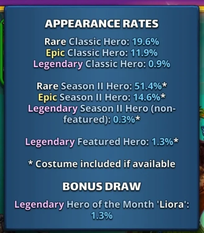 Season 2 : Atlantis Rises This thread is about Season 2 in reduced cost. The first occurrence appeared on February 2021 1. Event : Atlantis Rises (Reduced Cost) Core Rules: The basic functioning of the season (Stages, missions, etc.) remains the same as the original version. Find the base guide : Season 2: Atlantis Rewards: This season's usual rewards are improved and doubled. This event is very popular with players for farming and resources materials necessary for crafting items, basic resources or farming experience. New Feature: The main difference is the addition of "Dragon" monsters, which allow you to earn extra rewards when you complete the levels. 2. Access Conditions and Cost How to Access the Event Where to Find It: Access is via the Seasons Tab. Prerequisite: You must have completed up to stage 15 of season 1. Base Season: It is available permanently. Frequency (Summon Portal): It is part of a 4-day rotation among several seasons: S2 > S3 > S4 > S5 > UT1 > UT2 Energy Cost (Reduced) The levels in this event cost less World Energy than usual: Easy Mode: 3 to 7 energy. Hard Mode: 7 to 13 energy. 3. Specific Gameplay: Dragon What is a Dragon ? These are creatures that can appear randomly in levels. They grant extra rewards if you complete the level: Atlantis Coins Daily Clam Limit The quantity of Midgard Coins you can obtain is limited each day. Starting Cap: 15 clams per day. Increase: The limit increases by 15 each day up to a maximum of 60 clams per day. Monster Lure (Paid Option) The Monster Lure is an upgrade available through a special paid offer: It immediately increases your daily clam limit from 15 to 25 per day. It also increases the quantity of specific S3 pieces found in loot. 4. Atlantis Rises Summon Portal Summon Cost 1 Summon: Costs 350 Gems or 100 S2 Coins. 10 Summons: Cost 3000 Gems. 30 Summons: Cost 8400 Gems. Appearance Rate Presence of heroes from three groups: The heroes from Season 2. The heroes from Season 1 (but without costumes). A selection of old HOTM 5. Resources (Farming) Find the farming thread here: Infographics available by