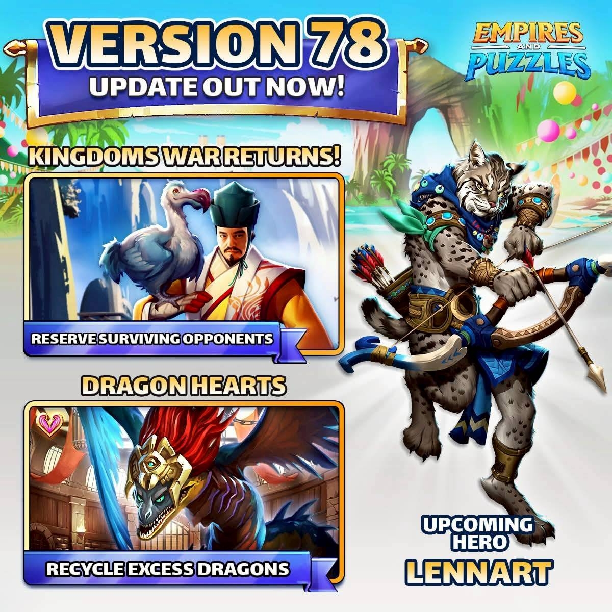 Version 78 Release Notes & Status News & Updates Claim your daily free gift! CLAIM GIFT Version 78 Release Notes & Status News & Updates EmpiresPuzzles Staff 2 Jun 17 Status June 19, 2025 10:00 AM: iOS rollout has started. June 16, 2025 1:20 PM: Android rollout started. We hope to do the same for iOS soon. Release Notes [NEW & UPDATED CONTENT] War of the Three Kingdoms improvements Outlaws of Liangshan Family New Passive: Health Boost on Critical Special Attack New feature: Reserve timer We’ve added a feature that allows you to continue your attack against the same opponent. This timer is activated if the opponent’s team was not fully defeated in your previous attack, and it reserves that opponent for you to attack again. Currently set to 60 seconds if you stay online after battle Fix: The pop-up for received Red Lucky Coins should now show up more reliably Dragon Hearts Convert unwanted Dragons into Dragon Hearts by using them to commend a Dragon that is already at max level. When you have collected enough Dragon Hearts you automatically get a reward. Commending Dragons follows similar rules as leveling up Dragons. Commending higher rarity Dragons earns you more Dragon Hearts but costs more resources. Dragon Hearts progress is shared among all Dragons. Hero League - Guest Heroes Each Hero League has a selection of Guest Heroes from the Featured Families that will assist you through League rounds. Guest Heroes are donated upon registration and are only available in this League. Guest heroes should only be visible in the League. No trace of them should appear in any other game modes. Best possible league defense team considering guest heroes should be preselected for defense/attack team upon registration. Within the League, there are no additional restrictions on Guest Heroes – they can be used like any other Hero. Guest Heroes will not be included in hero roster: They do not affect available slots They can not be pinned or set as favorite They do not affect Museum progress, PoA challenges, or missions Kalevala Event Booster Offer with Stage Gifts & family bonus Stage bosses updated with new Heroes and Costumes Kalevala Raid Brawl (Part I and II): Heroes of Kalevala family have increased attack, defense, health and mana generation. They resist mana reductions and status ailments that affect mana generation or prevent the use of Special skills. New rule for the Kalevala family: When a Special Skill deals damage, the target gets -30% accuracy for 2 turns. Wild Cats enter the Wilderness Summon Clawing damage updated Extra damage and defense reduction now also applies to enemies with active defense buffs Family bonus updated: If Special Skill damage is dodged, now also deals damage to the attacker Added new icon for Surge Bleed to better differentiate it from other Bleed effects Epic Hero Summon update The Epic Hero Summon now has a different Legendary Featured Hero each day. The Legendary Featured Heroes will be drawn from a selection that does not include the Classic Family. In-battle Hero Info The Hero Info Panel opens when you long press on a Hero during battle. Now it no longer immediately closes when you release your finger. The panel now remains open until you tap again outside of it. Recommended Alliances update Recommended alliances list now shows how active the Alliance is Average team power of the alliance is shown Also shows if some of the members have been inactive for multiple days [IMPROVEMENTS & FIXES] Improvements War Equalizer tooltip now specifies that it does not remove interminable effects. War defense team autofill function improved Improved the raid infobox. Now the info is divided into two panels outlining general battling rules as well as the extra rules specific to the raid modes. Push notification if you’ve participated in the war that is ending and you still have unused energy New roster filter: recency. Sort heroes and dragons so that the latest received ones are shown first. Multiline text input e.g. in the chat Fixes In dragon card view, the favorite button no longer overlaps with the pin button. Fixed an issue with Barkley’s special skill, which resulted in duplication of missiles if the targets had fiends. Fixed an issue where a Hero who was in a transformed mode, upon having a second transformation applied, would revert to their original appearance when the second transformation ended instead of the previous transformed form. Fixed an issue where the sleep status application and removal timings did not work correctly, resulting in it looking like heroes were casting skills while asleep