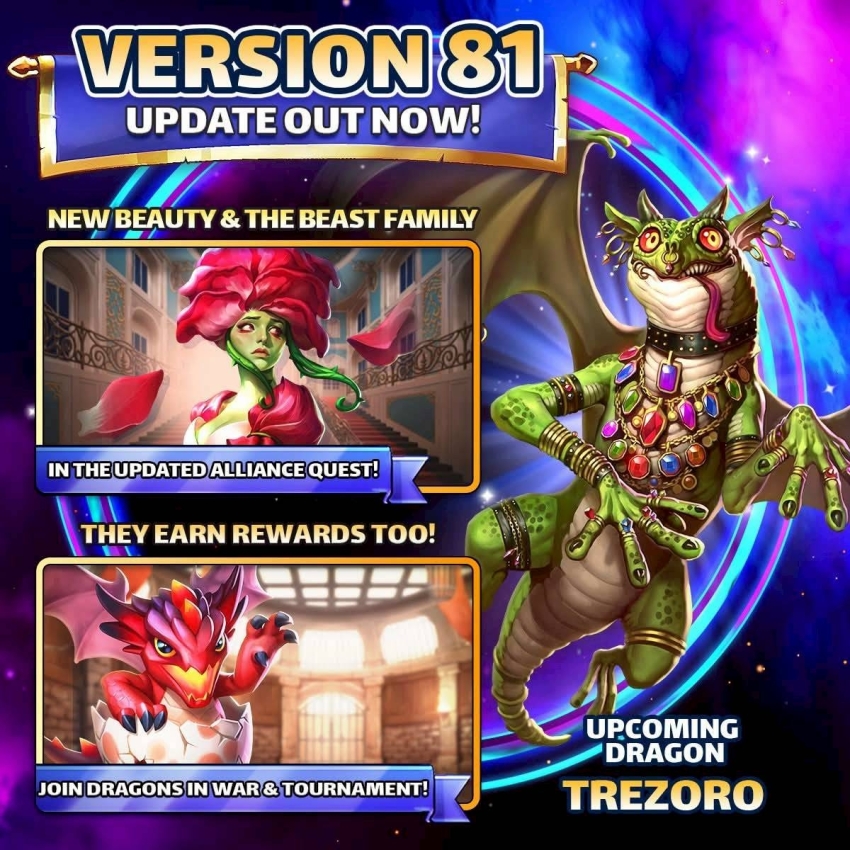 Version 81 Release Notes [NEW & UPDATED CONTENT] Black Friday gets powered up! Our incredible value Black Friday Summon returns with a power upgrade. Combining the ascension levels of Instant Power with the most recent hero pool of our classic Black Friday event, summon newer Heroes from all recent events who are already ascended, possibly even double limit broken! Black Friday also previews the upcoming Shady Scoundrels family, with sneaky new mechanics such as Ambush and Ransack. Don’t turn your back on these guys! Alliance Quest update: The Brave and the Beautiful In this updated event, the Brave Musketeers are joined by the brand-new Beauty and the Beast family. Updates: New Heroes and Costumes Quest story refreshed New stage bosses New Summon Chest with a chance of containing Master Emblems Monster Island is back with updates It’s been a while since we’ve visited Monster Island, and much has changed! Updates: Exploration changes Exploring a map tile will now have a variable energy cost, depending on the terrain type Some map tiles will now reveal more neighboring tiles than others when explored Monster Island Heroes (Abyss Hunter, Jungle Hunter, and Plain Hunter families) now receive bonuses to their attack, defense, and health stats based on their rarity Each horde type now has its own special skill and includes enemies of only one element Added an instructional “How to play” popup at event start Temple Summon debuts The great warriors of the Mahayoddha family, that were previewed in the Solstice Summon, are getting their own Summon! Temple Summon features the same chance of receiving double Legendary Event Heroes as the Astral Summon The matching Temple Quest is still in development, featuring new event rules Hero Academy improvements The pools of Heroes available from high-level trainings have been expanded and will continue to be updated automatically. Rare, Epic, and Legendary Heroes: Added a chance to receive non-Classic Heroes older than 730 days Legendary Costumes: When retraining a Legendary Hero, added a chance to receive ALL costumes older than 365 days Wars and Tournaments including Assist Dragons get extra dragon rewards The rewards from Skyfire Alliance Wars and Air Support Raid Tournaments, where players can bolster their Hero teams with Assist Dragons, now include dragon loot in addition to the standard rewards. Untold Tales 2 Event: Dwarven Riches All-new rare Dwarven Monoliths appear during this lower energy cost event in Untold Tales 2 Dwarven Riches event: Lowered world energy cost in all stages Hunt rare enemies for Untold Tales Coins Use a Lure to catch more rare enemies Aether Mimics enter the Secret Summon! These sniping treasure chests add elemental aethers and possibly alpha aethers to battle loot. New Alliance Highlight New alliances have "new" text on them when created. Searching alliances shows new on top if there are new alliances to highlight. After a few days the highlight of new disappears.