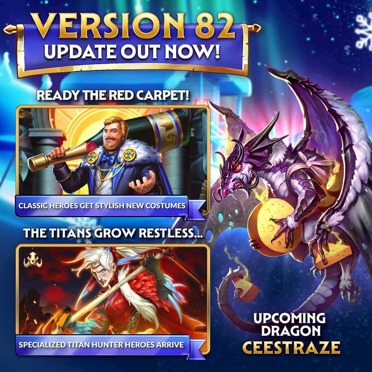 Version 82 Release Notes [NEW & UPDATED CONTENT] New Titan Hunter family The Titans grow restless and fearful. Specialized Titan Hunter Heroes are coming! A specialized summon containing new Titan Hunter heroes and a pool of hand-picked Heroes, perfect for facing the Titans. Stylish 5th costumes for Classic Heroes Ready the red carpet for Classic Heroes’ stylish new costumes! Bazaar Summon The Bazaar Summon offers another chance to get previously released Mimic Heroes and a new opportunity for Rare and Epic Mimic Heroes. Target your summons by choosing your featured Mimic Heroes! Hero Leveling improvements Added an XP bonus when sacrificing a duplicate Hero: Rare: +900%, for a total of 6,300 XP Epic: +2400%, for a total of 22,500 XP Legendary: 4900%, for a total of 60,000 XP Greater chance for special skill increase: Special Increase chance per Duplicate Character increased from 25% to 100%. Special Increase chance Multiplier per sacrifice rarity increased from 1% to 5%. Dragonspire – Tournament, and Rider buffs Dragonspire Tournaments now occur every other week. Get your Dragon Raid team ready! Removal of cap on stats boost provided by Dragon Rider With the limit removed, Heroes as Riders now contribute their full Attack, Defense, and Health stats to their Dragon Dragon Rider Boost in PvP* Dragon Riders provide 4x defense and 4x health bonuses in Dragon Raids and Dragonspire Tournaments. This boost is applied to both defense and attack teams. Travel to Dragonspire button* Still shows an icon if new Quests or full Chests are available Added a new icon to indicate that sign-up is open for Dragon Tournament Seasonal Event refresh: Season of Love Valentines Brawl A new Raid Brawl with buffs for the Cupid Family Season of Love Quest* The Quest and the seasonal booster have been updated [IMPROVEMENTS & FIXES] Improvements UI improvements to the for the Assist Dragon button in the Edit Team view Added more space for Assist Skill info in Assist Dragon Info view Added Additional Info view to the owned Status Effects Onyx and Crystal Dragon pets are now both unlocked by the Premium Timesaver VIP. * Onyx and Crystal Dragon Pets have also swapped places to show them in correct order with correct unlock descriptions. Fixes Fixed a visual issue with Mystic Vision Tower when seasonal decorations are enabled Fixed an issue with missing Family Bonus hero count for Nine Realms Heroes Fixed an issue with Ransack not checking for buff type and failing if target has a buff that cannot be reallocated Fixed an issue with Life Steal Healing not being blocked by Greed Fixed an issue where a Hero with Taunt active is not taking damage when targeted by a Special Skill Fixed an issue with Max Power Summon preview not showing extra Passives unlocked with Costume for base Hero Fixed an issue with partially ascended costumes that were received from Summons having incorrect costume bonus