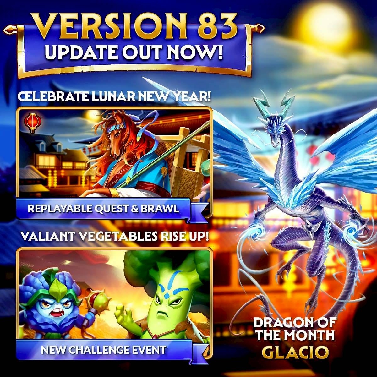 Version 83 Release Notes [NEW & UPDATED CONTENT] Lunar New Year season event refresh It’s time for some fireworks! Our Lunar New Year event returns with the updated event format that debuted at Halloween – replayable Quest stages with rare enemies, 2 Summons, and a Raid Brawl with a huge reward chest! Vigilant Vegetables Challenge Event February kicks off with an all-new Challenge Event featuring the Valiant Vegetable Heroes that were previewed last Fall in the Harvest Summon. Fight fiends with fiends and spread Growth! Troop Sparring Quest The Legendary Troop Summon gets a companion Quest designed to highlight the impact that Troops have on battles. Players now have a way to regularly earn Legendary Troop Coins! Dragonspire Summon improvements The Ancient Dragon Summon will be permanently available, and a chance for a bonus draw of a monthly featured Dragon will be added to all Summons! Ancient Dragon Summon Featured Dragon changes every week Comes with a weekly Ancient Underroot Quest! A new Dragon arrives every second week Earlier access to “Claim All” button The “Claim All” button, which allows you to collect all trained Heroes or Dragons up to your roster limit at once, will now become available at earlier building levels in the Stronghold Training Camp and Dragonspire Hatchery. Training Camp: Level 20 -> 10 Hatchery: Level 10 -> 1 [IMPROVEMENTS & FIXES] Improvements UI improvements for booster menu: appearance and use updated to match Resource Refill menu Insanity can no longer be applied on targets that are considered "absent" like Ghost Form, Hiding in a hole or Abyss All accuracy debuff effects now share the same icon Fixes Fixed an issue with Dragon Rider Boost. Boosted HP value is now accurate Fixed an issue where Mimic Heroes that were transformed while shielded would visually revert to an open Mimic when the shield buff expired Fixed an unintended interaction where Ransack could be blocked by Greed Fixed an issue with Ransack and Insanity so a random enemy now receives the stolen health and buffs Fixed a visual issue where defeating the final enemy using Ransack would not show the enemy being defeated before the Victory screen was displayed Fixed a visual issue with Ransack where defeating the last enemy in a wave using Ransack caused the enemy in the same position in the next wave to be invisible until they took damage Copying special skill animations with costumed Lord Loki and Kalo are now fixed Fixed a corner case issue where Alucard’s portrait disappears when killed on attack team Fixed an issue where Insanity amount would not show or not update correctly when multiple effects were applied in quick succession