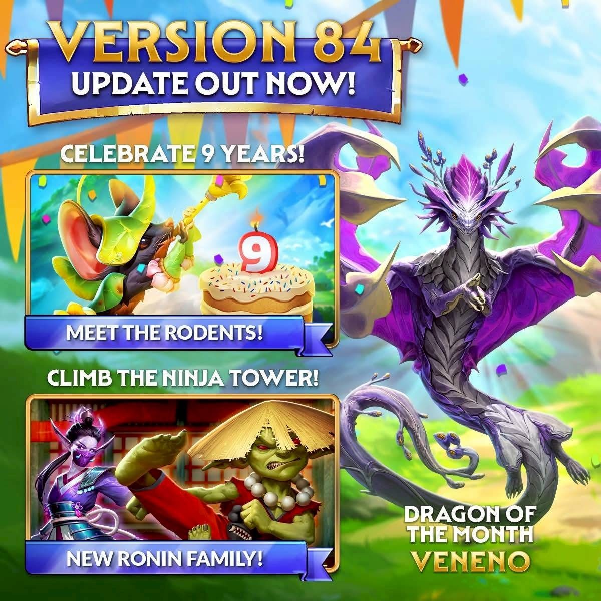 Version 84 Release Notes [NEW & UPDATED CONTENT] Celebrate 9 years of Empires & Puzzles! Our fantastic Birthday Summon is back with an awesome pool of Heroes, including 2 tiny but deadly members of an upcoming Family! Ninja Tower returns Battle your way up the tower and avoid the Oni curses with an all-new Family of wandering Heroes Get cracking with Springvale! It’s time for our Easter seasonal event. Play the quest and see the Springvale family’s newest members and outfits. Shop revamp! The in-game Shop is getting a new look! You’ll find clearer navigation, improved offers, and daily deals! [IMPROVEMENTS & FIXES] Improvements "Travel to Dragonspire" button's notifications are now cleared after visiting Dragonspire base view Gem summons in the Legendary Troop portal now count towards summon challenges Tidied up text formatting in Special Skill descriptions of Heroes that summon Fiends or Minions Improved readability of Special Skill text for Xandrella, Hansel, Gretel, and Pixie effects that trigger when enemy mana is full Fixes Fixed some unusual interactions between the Ransack ability and certain effects that trigger when a Hero is defeated Fixed an issue with Monster Island event info. Battle rules and details about active Relics now display correctly. Fixed an issue where Monster Island event bonus icon would sometimes be shown incorrectly for heroes not belonging to Hunter families Fixed a rare issue where "Continue with gems" dialogue would sometimes unintentionally appear more than once when trying to continue a Challenge Event stage after defeat Fixed a visual issue where the animation for Guillemette's status effect that attacks all enemies with Blood Lily stacks would play even when there were no enemies with Blood Lilies Fixed an issue where entering the Museum would not always jump to the listing for the first Hero with a claimable reward