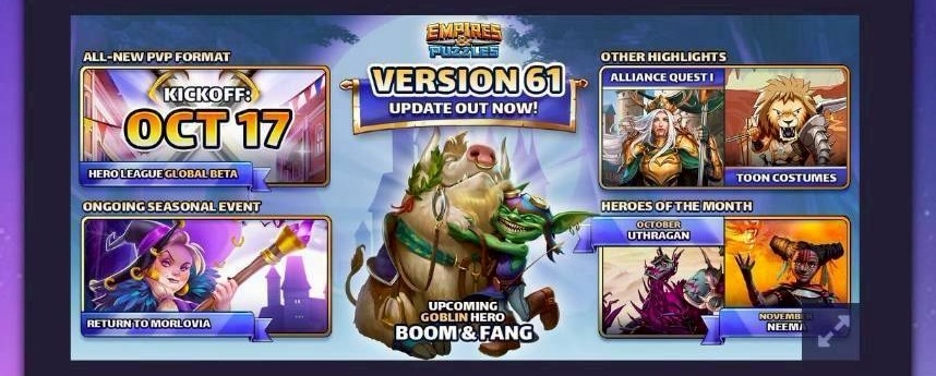 Version 60 Release Notes & Status News & Updates Claim your daily free gift! CLAIM GIFT Version 60 Release Notes & Status News & Updates EmpiresPuzzles Staff 2 Sep 2023 Version 60 Out Now - New Event: Gobling Village Status September 8, 2023 9:50 AM: Version 60 is now fully available on both platforms. Please update your game! September 6, 2023 2:00 PM: iOS rollout has started. September 5, 2023 3:30 PM: Edited schedule details for Hero League global beta. September 4, 2023 4:22 PM: Android rollout has started. We hope to do the same for iOS soon. Release Notes [NEW & UPDATED CONTENT] Goblin Village Sep. 18, 07:00 UTC – Sep. 21, 07:00 UTC New Goblin Summon When you summon a Legendary Goblin from the Goblin Summon, you get another Legendary Goblin as a bonus! New Goblin Heroes Legendary Deadboot Darkfeather Kettle Smarttongue Epic Goldie Rare Boots Family Bonus for 1/2/3+ Heroes: Each time this Hero takes damage from an enemy’s Special Skill, removes 30%/60%/100% boosted health from all enemies Passive: 20%/25%/30%/35%/40% chance (based on Mana Speed) to perform the following actions when this character casts their Special Skill: Deal 70% damage to all enemies All enemies get -25% accuracy for 3 turns New mechanic: Wither & Growth Wither: Lowers defense and/or attack for the duration of the battle Growth: Increases defense and/or attack for the duration of the battle Re-applications of Wither/Growth can further modify Ability Scores, up to a limit Ability Scores can be increased to a maximum of {}% of their original value Ability Scores can’t be reduced to lower than {}% of their original value Modified Ability Scores cannot be dispelled or cleansed Modified Ability Scores remain even after the caster is defeated Regular buffs and debuffs are applied to modified Ability Scores New mechanic: Mega Minion A Hero can only have one Mega Minion at a time All existing Minions and Fiends are replaced when a Mega Minion is summoned Mega Minions cannot be replaced by Minion or Fiend summons Mega Minions are not affected by effects that destroy or otherwise affect Minions Hero League (Global Beta) Sep. 19, 07:00 UTC – Oct. 23, 07:00 UTC (EDIT: Postponed for now, new start date TBA) An all-new competitive format in which players Raid for glory and survival in a monthlong League! Each League runs for 4 rounds At the end of each round, the bottom 25% scorers are eliminated Battle other players and accumulate points to reach the final round! NOTE: Not connected to Raid Arena or Raid Tournaments Special Event Bonuses Featured Families +30% increase to all stats Featured Families are designated at the start of a League and do not change between rounds Featured Classes +10% increase to all stats Featured Classes change each round Regular Schedule Registration Phase (7 days) Register for the League and prepare your Defense Team! Battle Phase (each league has 4 rounds; each round runs for 6 days) Earn points by conducting attacks Maximum of 10 attacks per day Points are affected by a number of factors, such as whether you won, how many enemy Heroes you managed to defeat, and how well you matched shields during the battle Each opponent features a Difficulty Bonus that is calculated by comparing the performance of their Defense Team to your performance in previous attacks Fleeing a battle before it is over will result in 0 points At the end of each day, players receive Defense Points based on their Defense Team’s performance Cooldown Phase (occurs between rounds and lasts for 1 day) All players are unable to battle during this Phase The bottom 25% scorers from the previous round are eliminated Eliminated players cannot play in the next round Rewards Loot is received when you are eliminated OR after the final round ends Rounds-based loot is determined by your last Round reached Ranking-based loot is determined by your final rank (which is determined by your final score) As in other events, players receive only the rewards from the highest loot tier they belong to PLEASE NOTE: The rewards set for this September’s Hero League are placeholders for testing. They may change after Hero League exits global beta and is “officially” launched. Return to Morlovia Sep. 25, 07:00 UTC – Nov. 6, 07:00 UTC New Legendary Heroes Amber Edwin Lucinda Untold Tales: Chapter V Sep. 27, 07:00 UTC – Oct. 1, 07:00 UTC New stages, new stories, new Heroes! Please note: Some boss enemies in Chapter V may use placeholder animations until they are released as obtainable Heroes [BALANCE ADJUSTMENTS] Counterattack no longer interacts with “friendly fire” damage dealt by an allied character (e.g., Mok-Arr) “Dodge Special Skills that deal damage” effects, when activated, now dodge ALL effects from the incoming Special Skill Previously, any effects applied before the Special Skill’s first attempt at inflicting damage would not be dodged The Cleanse Block status ailment can no longer be cleansed Previously, when cleanse was performed on a character inflicted with Cleanse Block, other status ailments would not be cleansed but the Cleanse Block effect itself would be cleansed [IMPROVEMENTS & FIXES] Improvements Testing a doubly powerful version of Mystic Tower Every 2 hours, you can watch 1 Mystic Vision → 2 Mystic Visions This change applies as soon as you update to Version 60 Drop rates from Mystic Vision have not been modified Please note that this is a test run and details may change in the future Improved the following texts for clarity: Description text for Cleanse Block Description text for Dispel Protection Description text for Special Skills that damage “a random different enemy” Added rewards to Horde battles (Monster Island) Added Trainer Hero element & rarity details to Aether Summon previews Mok-Arr’s Special Skill animation is now played on both sides! Stage/Floor Rewards screens in Challenge Events and Tower Events now display the usual warning message (“FULL”) when you have max Recruits Fixes