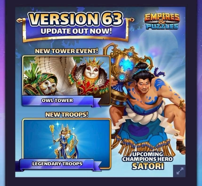 Version 63 Release Notes & Status News & Updates Claim your daily free gift! CLAIM GIFT Version 63 Release Notes & Status News & Updates EmpiresPuzzles Staff 3 Dec 2023 V63 Update Out Now Status December 15, 2023 9:50 AM: Version 63 is fully released on all platforms. December 14, 2023 9:36 AM: iOS rollout has started. December 11, 2023 2:45 PM: Android rollout has started. We hope to do the same for iOS soon. Release Notes [NEW & UPDATED CONTENT] Legends Summon refresh Tavern of Legends returns on Dec. 19, 07:00 UTC “Choose your Featured Hero” option added The Legends Summon no longer includes Legendary Classic Heroes A mystery Hero has been added to the Legends Summon! Mystic Summon Selected Event Summon Gates will now sometimes include a free Mystic Summon Watch an ad for one free pull from the Event Summon Limited to one Mystic Summon per Event The Mystic Summon shares the same pool of Heroes as the Event Summon, but the appearance rates are different Mystic Summon is also replacing the free ad summon in the Daily Summon Gate One free ad summon per day, as before, but with improved rewards and chance of a bonus Trainer Hero! Tower Event: Owl Tower Dec. 20, 07:00 UTC – Dec. 24, 07:00 UTC New Tower Event: Tower of Owls 25 Stages Normal difficulty 25 Stages Impossible difficulty New Owl Heroes: Legendary Fulvia Timius Relius Ommodus Livia Epic Olbec Rare Paeia Featherino New offense buff: Moonrise Strike New defense buff: Moonrise Ward Season of Love Jan. 8, 07:00 UTC – Feb. 4, 07:00 UTC New Legendary Heroes Kabeiroi Elba Eros Quest refreshed with new heroes as Bosses Refreshed Booster stage rewards Perfect 10 Summon Chance to do a Perfect 10 summon only in the 10x summon Includes a random Seasonal Legendary hero and Bonus items Can only occur once every 24 hours Legendary Troops This feature will go live on Jan. 2, 07:00 UTC Class based 5 star troops Each troop class has their own stats Troop can be equipped to any hero Each Troop has two preferred classes Gives extra stats and a passive effect if equipped to a preferred class Each troop has a unique passive effect. Leveling up Requires Iron Milestones Every 10 levels boost to bonus class stats Requires Class Emblems Converting Epic Troops to Legendary Minimum Barracks building level for conversion to be available: lvl 10 Conversion requires Iron and Emblems Conversion will have a cooldown: 28 days Conversion will have an Epic Troop Level Requirement that goes up with number of Epic Troops converted Epic Troop Level Requirement: Lvl 26: 0 Epic Troops converted Lvl 27: 1 Epic Troops converted Lvl 28: 2 Epic Troops converted lvl 29: 3 Epic Troops converted lvl 30: 5 Epic Troops converted Troop Sacrifice XP boost This change will go live on Dec. 19, 10:00 UTC All troops will now give more XP when sacrificed Cheaper leveling - the food cost per sacrificed troop when leveling up an Epic Troop now increases by only 2500 per level, instead of the old figure of 5500 Goal is to lower the time and resources required for leveling up troops [IMPROVEMENTS & FIXES] Improvements Colors in Smarttongue’s special skill animation were adjusted to better fit the hero’s element. Adjusted the icons for 2 passive skills for the Bard Family to better communicate their effects visually. Fixes Fixed an issue with Cel’s Special Skill description. Fixed an issue with Erebus’ status effect blocking new minions and dealing damage per attempted summon. The issue allowed the target to transfer the status effect away through a passive skill before the damage was dealt, which is no longer happening. Fixed an issue where status effects that scale every time the Hero is hit would not carry their increased values after being redistributed The icon for the critical hit chance effect was adjusted for some heroes to make it consistent across the game. Fixed an issue that resulted in Passive skills that have “Activations left” not counting correctly. Removed “Connect to Facebook” button. Fixed an issue that resulted in an edited Raid Attack Team not being automatically selected for battle. Fixed an issue with Flip’s special skill animation. Fixed an issue with Poseidon’s status effect not providing resistance to new negative mana effects. Now it correctly resists effects that it previously let be applied.