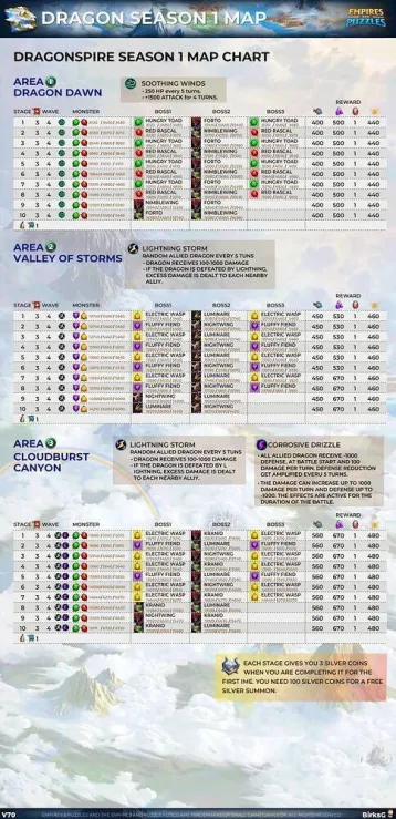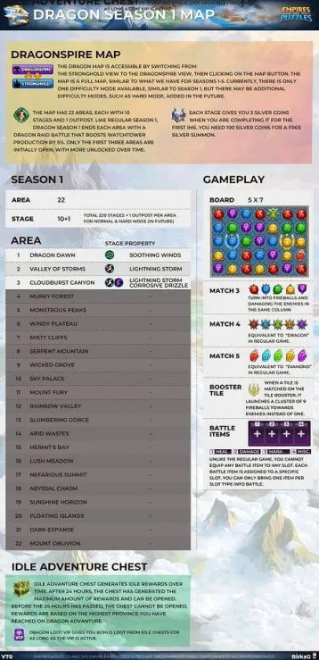 Sep 2024 This thread is to provide early insights on the Dragon Map Area and Gameplay. Dragon Map Overview Dragon Map is accessable if you switch from Stronghold view to Dragonspire view, and you click on the Map button. The Map is a full Map like what we have for Season 1-5. There is only 1 difficulty mode like in Season 1. The Map consist of 22 Areas, and each Area has 10 stages + 1 Outpost. Similarly to Season 1 each Area now ends with and Outpost, which is a Raid battle, and it gives +5% production increase for Wathctower. You need to have a Watchtower build to complete this stage. So there are 220 stages in total +21 Outposts (if there is no Outpost at the end of the last Area). The Areas have got an own name. You can only complete stages in order. Tile Boosters The Map stages boards consist of tiles in 5 rows and 7 columns. You can match at least 3 tiles from the same element. When tiles are matched they turn into fireballs and they damaging the enemies in the same column. If you match 4 tiles, then you get a special tile like the “Dragon” in the regular game, and if you activate it, then the tiles above, below, left and right are also explode. If you match 5 or more tiles, then you get a special tile like the “Diamond” in the regular game, and if you activate it, then the tiles In the third row the second and the sixth tiles is a “Tile Booster”. When a tile is matched on the Tile Booster, it launches a cluster of 9 fireballs towards enemies instead of one Battle Item Slots There are 4 Battle Item Slots similar to the regular game, but unlikely to the regular game you can not equip any battle items to any slot. Each Battle Item has a Slot Type assigned to them: Heal: Small Healing Salve, Medium Healing Salve, Super Healing Salve, Cleansing Feather, Healing Comet, Angel Feather Damage: Ballistae Attack, Ice Attack Spell, Poison Attack Spell, Storm Attack Spell, Mana: Small Mana Shards, Medium Mana Shards, Super Mana Shards, Mana Comet Misc: Veil of Attack, Veil of Protection, Veil of Eternity You can bring only one item per slot type into battle. Enemies Each enemy is brand new, and all of them have Special Skills. Dragon WE Costs The stages consume Dragon World Energy. The WE Costs for the first 3 visible Areas is 3. Silver Coins Each stage gives you 3 Silver Coins when you are completing it for the first ime. You need 100 Silver Coins for a free Silver Summon. Missions There are no Avatar missions for the Dragon Map yet. Area Properties Each Area has an own Level property, which are the following. Unique Dragon Boss Stage 10 of Area 9, 11, 13, 15 and 18 Features a Unique Dragon Boss. This battle takes places against an Unique Dragon Boss. The Unique Dragon Boss heals itself and buffs are dispelled from the Dragons every 5 turns. This is a like fighting against a Titan (with Weak spot which paralises it) after couple enemy waves. Area Completion rewards You can collect rewards after you have finished all stages and the outpost level for each area. Guides by BirksG