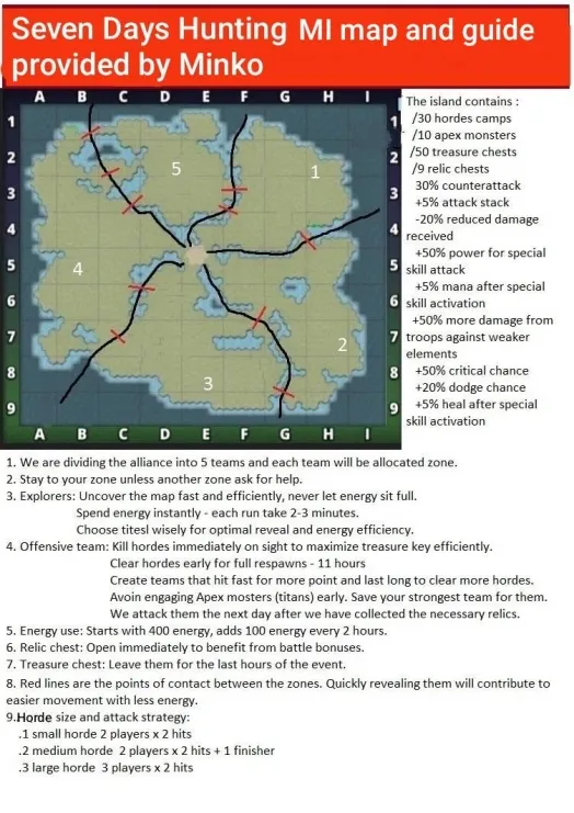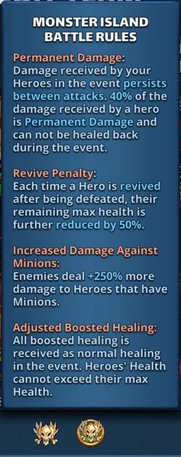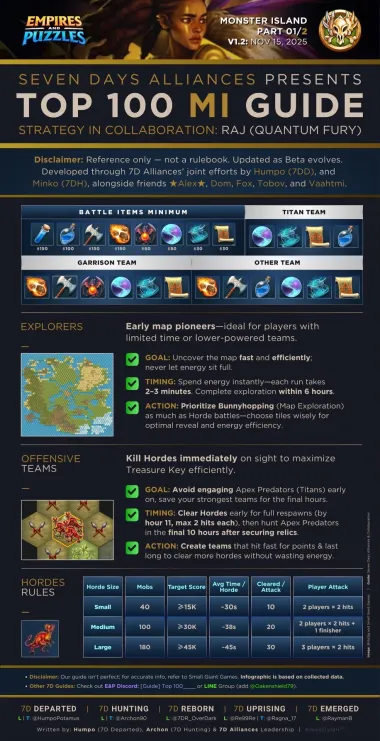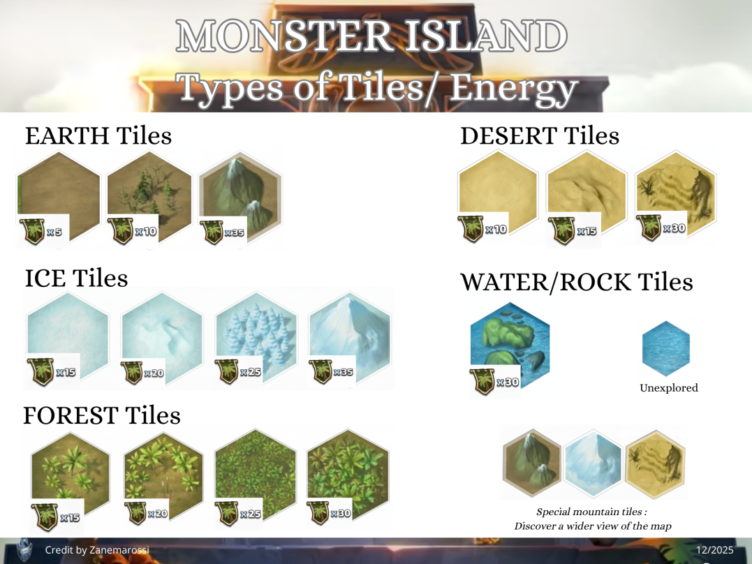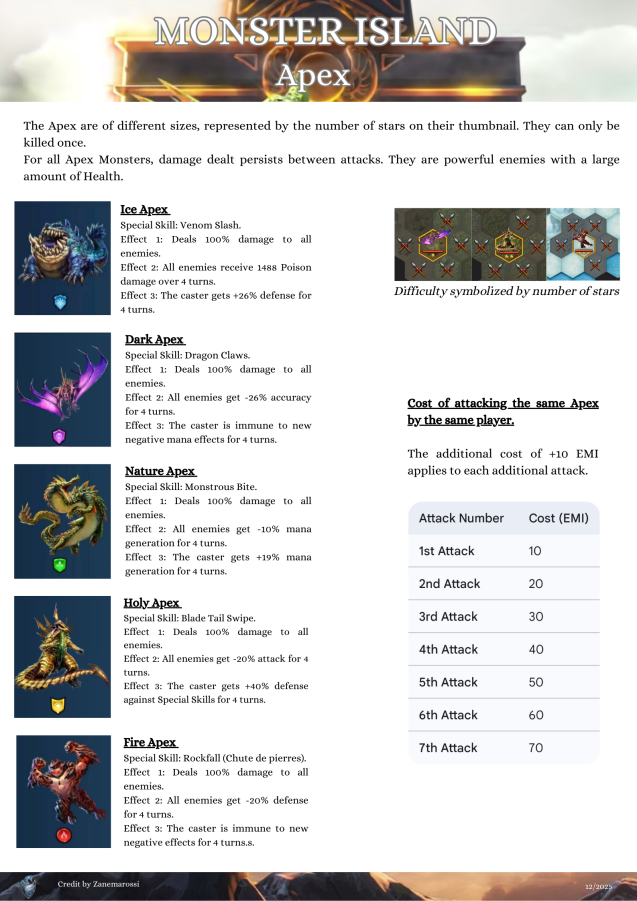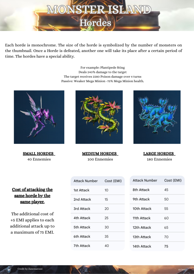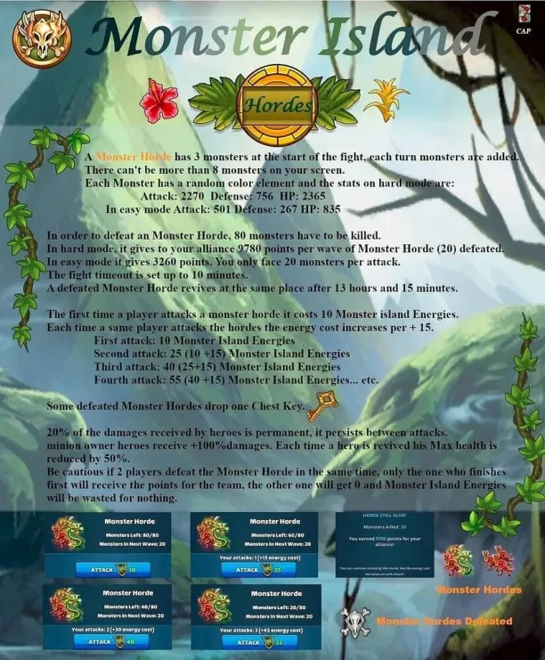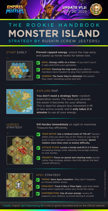 This topic discusses the Alliance event "Monster Island," which first occurred in November 2022. Table of Contents Overview Access Requirements and Difficulty Levels Interface The Map and Energy (EMI) Hero Management The Hordes The Apex Chests Rankings and Rewards Summoning Portal Monster Island Families Various Documents & Community Playlist I. Overview A. Exploration of the Mystery Island Monster Island is an alliance event based on cooperation, energy management, and team strategy on a large, unexplored island. Beta Status: This event is currently being tested; changes are still possible. Last updated: November 2025. All alliances explore the same base map and start at the base camp in the center. The position of specific gameplay elements is unique to each alliance. Find the color nomenclature for the map. B. Difficulty and Ranking Four levels are available: Easy, Medium, Hard, and Very Hard. Impact: This difficulty level determines the strength of the monsters on the island and affects alliance rankings (alliances are ranked only among themselves). C. Event Duration The event takes place in two distinct phases: Preparation Phase (24 hours): Players have 24 hours to join an alliance to validate their participation. Exploration Phase (48 hours): Exploration begins and lasts 48 hours. Important: Once the exploration phase has started, any alliance change (joining or leaving) excludes the player from the event. D. Your Objectives The main objectives are: Earning Points: Obtain these by scouting the map, overcoming Hordes (recurring foes), and challenging the mighty Apex (unique bosses). Looting: Discover Relic Chests (on-field support) and Treasure Chests (shared alliance bonuses). Ranking: Based on your final score and the portion of the island uncovered within your group. Rewards are issued once the event concludes. II. Access Requirements and Difficulty Levels A. Prerequisites for the Island Must be part of an alliance before the start of the event. The alliance score must be at least 10,000. B. Difficulty Options The event's difficulty is based on your alliance's power (measured by the Titan you defeat each day). Available Levels: Easy, Medium, Hard, Very Hard. This choice impacts: The strength of the monsters on the island. The ranking you participate in (and therefore the rewards you receive). III. Interface A. Top Banner (Status and Resources) Energy (EMI): Island-specific energy, capped at 1000 total. Recharge time is indicated. Keys: Two distinct counters: one for Treasure Chests and one for Relic Chests. Treasure Chests: Indicates the number of Treasure Chests found. Trophies: Indicates the number of points accumulated by the alliance. B. Left Banner (Menus and Navigation) Four main buttons are accessible on the Left Banner: Settings/Info: Opens a detailed menu: Activation/Deactivation of the alliance chat view. Island Information: official event information. Ranking: alliance ranking and alliances according to difficulty level. Rewards: projected rewards to be obtained. Alliance Information: event history and player points summary. Hero List: view your heroes and items available for the island and those that can be killed. You cannot change your team here. Relics: Indicates the details of the relics found, corresponding to combat bonuses for the alliance heroes. Navigation (Mini-Map): Preview: Open the map miniature. Estimation & Visualization: Click once on the desired zone (the white cursor) to see the energy cost (EMI) and visualize the elements (monsters, chests, teammates) present in that zone. Movement: A second click triggers movement to that zone. Warning: An accidental click can cause unintended movement and energy loss. Exploration: You must slide on the greyed-out zones. Island elements (chests, hordes, apex) are displayed with brighter areas. Safety: You can slide on the map safely without risk of movement (and therefore without energy loss). Profiles: You can view a teammate's profile (team used, items, remaining energy). C. Right Banner (Alliance Activity) News Feed: Displays the latest actions performed by players and the sector concerned. You can click on this area, which will open the detailed "Alliance Information" menu. Someone discovered a horde in “A2” Someone defeated a horde in… Someone discovered an apex monster in… Someone defeated an apex monster… Someone discovered a treasure chest… Someone discovered a relic chest… Someone discovered a key (for a chest)… Someone obtains a new relic for all alliance members Horde reappeared in… Sector: Indicates the sector you are currently viewing on the screen. D. Center and Bottom of the map Main game zone: map of the island to explore. Alliance Chat (bottom): a specific chat for the island can be activated or deactivated from the settings. IV. The Map and Energy (EMI) Credit by BirksG, Turan The island is very vast (more than 3000 tiles), of which about 1800 tiles are explorable. You start at the Base Camp on a black map. A. Exploration Cost and Points Exploration and movement consume dedicated energy (EMI). Each explored tile grants 750 points. Initial Cost (depending on tile type): Earth Tile: 5, 10 or 35 EMI. Desert Tile: 10, 15, or 30 EMI. Ice Tile: 15, 20, 25 or 35 EMI. Forest Tile: 15, 20, 25, or 30 EMI. Water/Rock Tile: 30 EMI Water zones are unexplorable. Reduced Cost: Exploring an already visited tile costs only 1 EMI. Exploration reveals adjacent tiles (which turn grey). Mountain tiles reveal a larger area (The size differs depending on the mounting type) B. Energy Management (EMI) Start: You begin the event with 500 EMI. Automatic Recharge: You receive 100 EMI every 2 hours and 25 minutes (2h25). Cap: The maximum cumulable is 1000 EMI. Any energy recharged beyond this cap is lost. Total Energy : 2,500 / player, or 75,000 energy for an alliance of 30 players. Find the energy respawn information here: V. Hero Management You must return to the Base Camp to change your team or replenish 