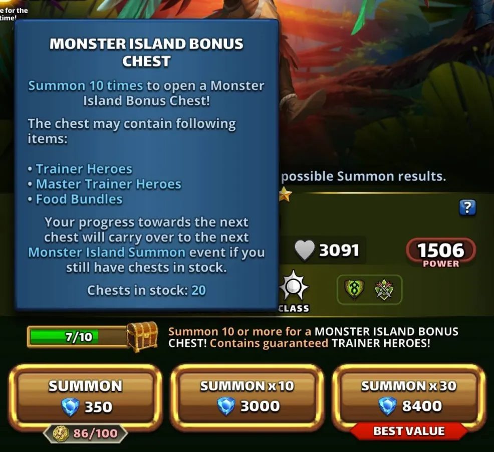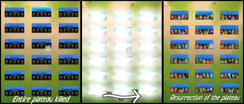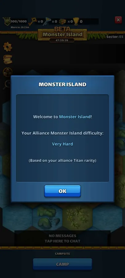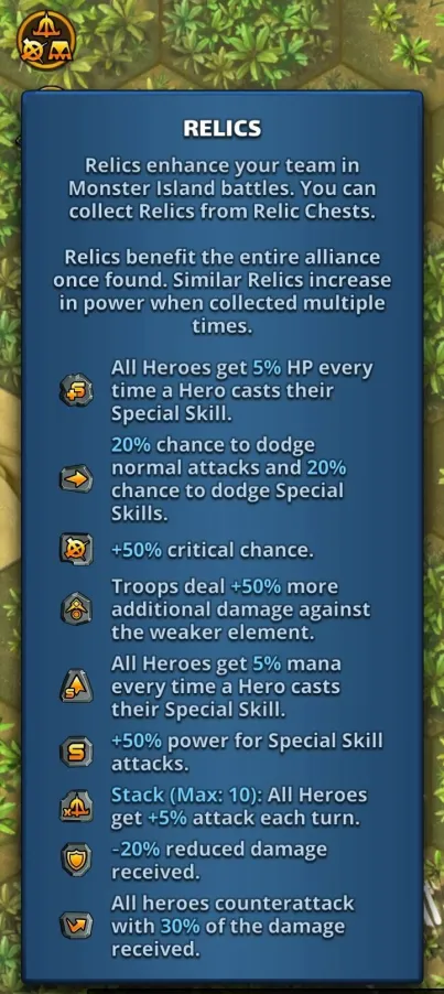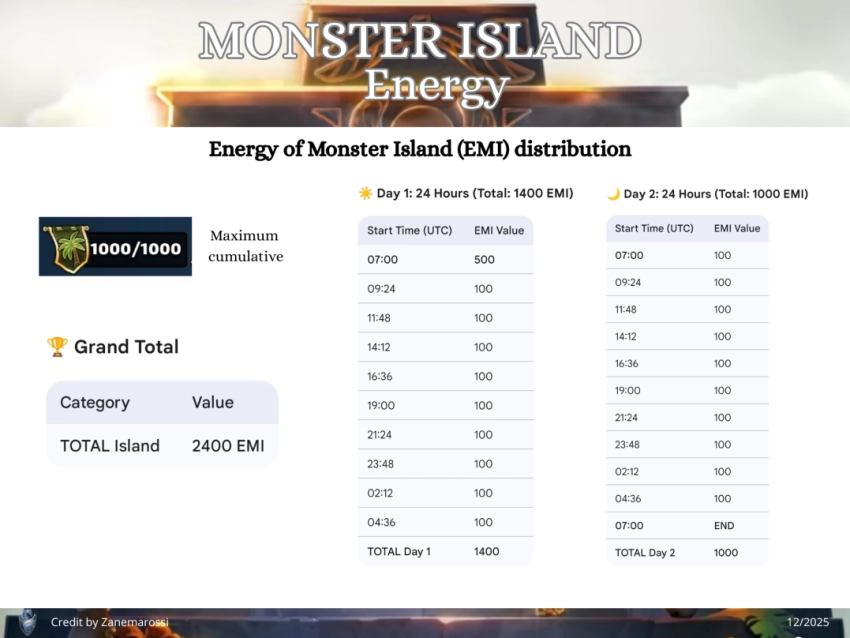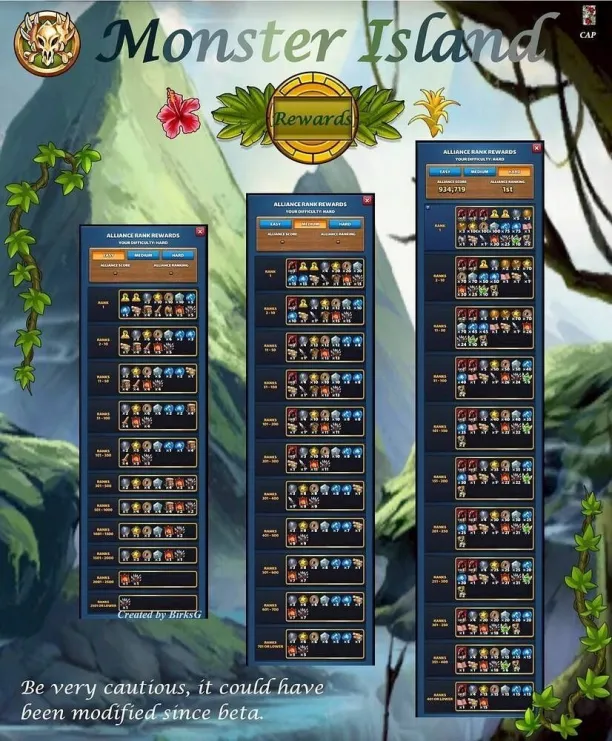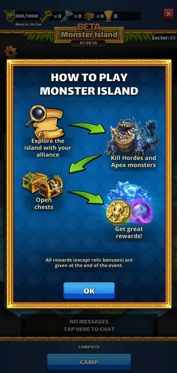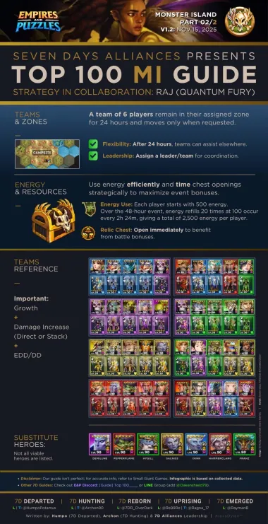 This topic discusses the Alliance event "Monster Island," which first occurred in November 2022. Table of Contents Overview Access Requirements and Difficulty Levels Interface The Map and Energy (EMI) Hero Management The Hordes The Apex Chests Rankings and Rewards Summoning Portal Monster Island Families Various Documents & Community Playlist I. Overview A. Exploration of the Mystery Island Monster Island is an alliance event based on cooperation, energy management, and team strategy on a large, unexplored island. Beta Status: This event is currently being tested; changes are still possible. Last updated: November 2025. All alliances explore the same base map and start at the base camp in the center. The position of specific gameplay elements is unique to each alliance. Find the color nomenclature for the map. B. Difficulty and Ranking Four levels are available: Easy, Medium, Hard, and Very Hard. Impact: This difficulty level determines the strength of the monsters on the island and affects alliance rankings (alliances are ranked only among themselves). C. Event Duration The event takes place in two distinct phases: Preparation Phase (24 hours): Players have 24 hours to join an alliance to validate their participation. Exploration Phase (48 hours): Exploration begins and lasts 48 hours. Important: Once the exploration phase has started, any alliance change (joining or leaving) excludes the player from the event. D. Your Objectives The main objectives are: Earning Points: Obtain these by scouting the map, overcoming Hordes (recurring foes), and challenging the mighty Apex (unique bosses). Looting: Discover Relic Chests (on-field support) and Treasure Chests (shared alliance bonuses). Ranking: Based on your final score and the portion of the island uncovered within your group. Rewards are issued once the event concludes. II. Access Requirements and Difficulty Levels A. Prerequisites for the Island Must be part of an alliance before the start of the event. The alliance score must be at least 10,000. B. Difficulty Options The event's difficulty is based on your alliance's power (measured by the Titan you defeat each day). Available Levels: Easy, Medium, Hard, Very Hard. This choice impacts: The strength of the monsters on the island. The ranking you participate in (and therefore the rewards you receive). III. Interface A. Top Banner (Status and Resources) Energy (EMI): Island-specific energy, capped at 1000 total. Recharge time is indicated. Keys: Two distinct counters: one for Treasure Chests and one for Relic Chests. Treasure Chests: Indicates the number of Treasure Chests found. Trophies: Indicates the number of points accumulated by the alliance. B. Left Banner (Menus and Navigation) Four main buttons are accessible on the Left Banner: Settings/Info: Opens a detailed menu: Activation/Deactivation of the alliance chat view. Island Information: official event information. Ranking: alliance ranking and alliances according to difficulty level. Rewards: projected rewards to be obtained. Alliance Information: event history and player points summary. Hero List: view your heroes and items available for the island and those that can be killed. You cannot change your team here. Relics: Indicates the details of the relics found, corresponding to combat bonuses for the alliance heroes. Navigation (Mini-Map): Preview: Open the map miniature. Estimation & Visualization: Click once on the desired zone (the white cursor) to see the energy cost (EMI) and visualize the elements (monsters, chests, teammates) present in that zone. Movement: A second click triggers movement to that zone. Warning: An accidental click can cause unintended movement and energy loss. Exploration: You must slide on the greyed-out zones. Island elements (chests, hordes, apex) are displayed with brighter areas. Safety: You can slide on the map safely without risk of movement (and therefore without energy loss). Profiles: You can view a teammate's profile (team used, items, remaining energy). C. Right Banner (Alliance Activity) News Feed: Displays the latest actions performed by players and the sector concerned. You can click on this area, which will open the detailed "Alliance Information" menu. Someone discovered a horde in “A2” Someone defeated a horde in… Someone discovered an apex monster in… Someone defeated an apex monster… Someone discovered a treasure chest… Someone discovered a relic chest… Someone discovered a key (for a chest)… Someone obtains a new relic for all alliance members Horde reappeared in… Sector: Indicates the sector you are currently viewing on the screen. D. Center and Bottom of the map Main game zone: map of the island to explore. Alliance Chat (bottom): a specific chat for the island can be activated or deactivated from the settings. IV. The Map and Energy (EMI) Credit by BirksG, Turan The island is very vast (more than 3000 tiles), of which about 1800 tiles are explorable. You start at the Base Camp on a black map. A. Exploration Cost and Points Exploration and movement consume dedicated energy (EMI). Each explored tile grants 750 points. Initial Cost (depending on tile type): Earth Tile: 5, 10 or 35 EMI. Desert Tile: 10, 15, or 30 EMI. Ice Tile: 15, 20, 25 or 35 EMI. Forest Tile: 15, 20, 25, or 30 EMI. Water/Rock Tile: 30 EMI Water zones are unexplorable. Reduced Cost: Exploring an already visited tile costs only 1 EMI. Exploration reveals adjacent tiles (which turn grey). Mountain tiles reveal a larger area (The size differs depending on the mounting type) B. Energy Management (EMI) Start: You begin the event with 500 EMI. Automatic Recharge: You receive 100 EMI every 2 hours and 25 minutes (2h25). Cap: The maximum cumulable is 1000 EMI. Any energy recharged beyond this cap is lost. Total Energy : 2,500 / player, or 75,000 energy for an alliance of 30 players. Find the energy respawn information here: V. Hero Management You must return to the Base Camp to change your team or replenish 