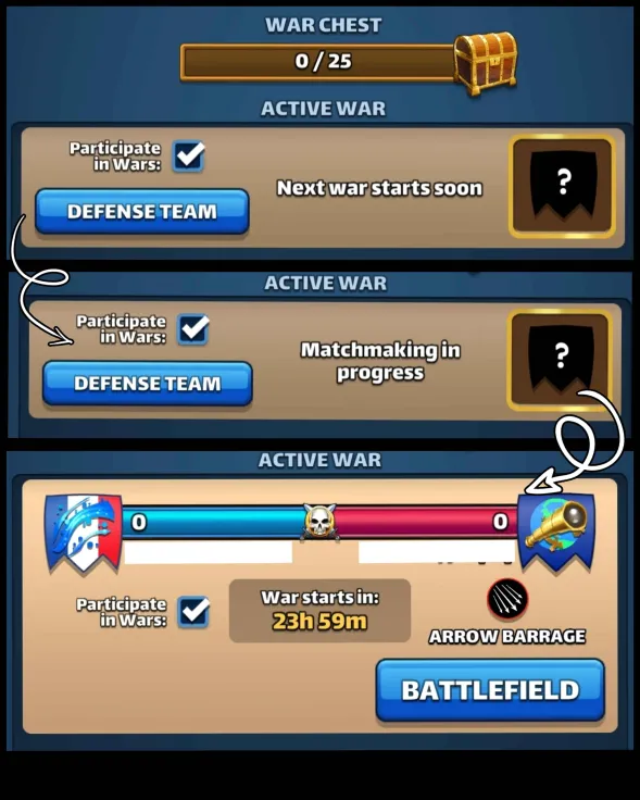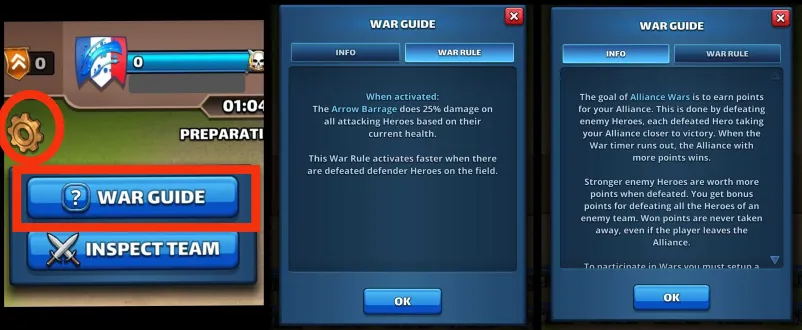 This thread is about Alliance Wars (Parameters, specific features, gameplay, tips…) Table of Contents I. Basics of Alliance Wars II. Participation Conditions and Requirements III. War Schedule IV. War Phases : Matchmaking V. War Phases : Preparation Phase VI. War Phases : Battle Phase VII. Advanced Warfare : Mechanical War Support VIII. War Playlist I. Basics of Alliance Wars Alliance Wars are direct competitions between teams (Alliances). The battle principle is similar to regular Raids, but you use a specific War Energy unique to this mode. Rewards All participants, whether they win or lose, receive points. These points are accumulated and stored in a War Chest, which you open once it is full. II. Participation Conditions and Requirements To take part in an Alliance War, you must meet these conditions: Alliance Membership Player Level: Reach or exceed level 12. Hero Roster: Own at least 30 heroes. Participation Declaration: Confirm your participation during the Matchmaking Period. III. War Schedule The Alliance War cycle takes place twice a week: From Wednesday to Thursday. From Saturday to Sunday. Note: The war start time may vary depending on the alliance size. Specific support wars take place. The alternation occurs every 2 wars. The current rotation is: Credit BirksG IV. War Phases : Matchmaking The Matchmaking Period begins 24 hours before the official start of the war. This is the only window to confirm your participation. Participation Criteria Opponents are automatically matched based on Alliance Strength. ALLIANCE STRENGTH CALCULATION It is determined by the War Score, which is based on the strength of the top 30 heroes and the army power of participating members, as well as historical performance. MINIMUM ALLIANCE SCORE An alliance with an aggregate score below 3250 is ineligible to participate. ALLIANCE OPT-OUT OPTION Alliance Leaders can opt out of the war for the entire alliance. If they do, individual members can still choose to join. INDIVIDUEL PARTICIPATION A countdown shows when matchmaking begins. You must check yourself in before this countdown to take part in the war. You can toggle your participation after matchmaking without affecting the current war. Your choice will apply to the next one. NUMERICAL UMBALANCE Discrepancies have been observed between the total number of opposing members during encounters. These disparities may arise from various factors. Participant Management Enabling or disabling a player’s participation during the “Searching for Opponent” process in matchmaking can cause a numerical imbalance. War Score Fairness Significant differences in alliance war scores can also affect team size. The alliance with the higher overall score may have fewer members, resulting in a reduction of six potential strikes during the confrontation. V. War Phases : Preparation Phase (24 Hours) Each player registered for war is displayed with a small blue tag (Our alliance) or red tag (opposing alliance) showing: Player Name Status – Indicated by a green (Online) or red dot (Offline) Team Power – Indicates the team’s total strength (heros, troops, support dragons) Defence heroes – The five defence heroes are displayed. If a hero is killed, they appear with a skull. Hero Health – The green bar above the hero displays their current Health (HP). War Energy – Represented by an orange flag. 1. PLAYER POSITIONING During the preparation phase, each member’s position on the battlefield may change randomly with each new login. Despite this randomness, a member’s rank change (promotion or demotion) forces an automatic position adjustment. LEADERSHIP PLACEMENT The Alliance Leader is always placed in the center, front row. Co-leaders stand next to the Leader in the front row or are distributed on subsequent rows if numerous. Once the attack phase begins, positions are locked. The only exception allowing position changes after the war begins is a change in rank. TARGET IDENTIFICATION TOOLS Reading grids are available for mapping target positions with different reading layouts. These tools can be essential for developing attack strategies, coordination, and tactical communication within the Alliance. 2. SETTING UP THE DEFENSE TEAM Each player must specifically compose a Defense Team of five heroes for Alliance War by clicking the “Edit” button below their defense. The “Info” button allows viewing a full defense setup (including troops and hero cards). The defense is paramount. The Tank hero (in the center) is one of the keys. Choose it wisely (based on its color, its type, or its skills). Alliance strategies regarding the defensive composition are often encountered. BY DEFAULT If no action is taken, the heroes and troops from the previous war are automatically reused. If no defense heroes were ever set, it may appear grayed out until the player takes action. MODIFICATION RESTRICTION Once the war begins, the defense team composition cannot be changed. Any upgrades to heroes or troops during the war have no effect on the ongoing war’s results. TEMPORARY EXIT FROM ALLIANCE You may leave the Alliance, but it is risky. When you leave, even temporarily, your name in the defense will be replaced with “[Ex-member]”. If you leave while checked in for a war, you’ll receive a message showing the deadline to return and still participate. If you don’t return in time, you’ll remain marked as “[Ex-member]” and won’t be able to use your flags in that war. Even if you return on time, a bug may still prevent participation. Leaving the alliance after the battle starts means your remaining flags will be lost to your Alliance. VI. War Phases : Battle Phase (24 Hours) 1. GENERALITIES Battles can be launched at any time during the war using available War Energy. FLAGS Each participating player receives six (6) attack flags (attempts). Initial Flags: Three (3) available at battle start. Increment: The remaining three (3) are added 12 hours later. USAGE LIMIT