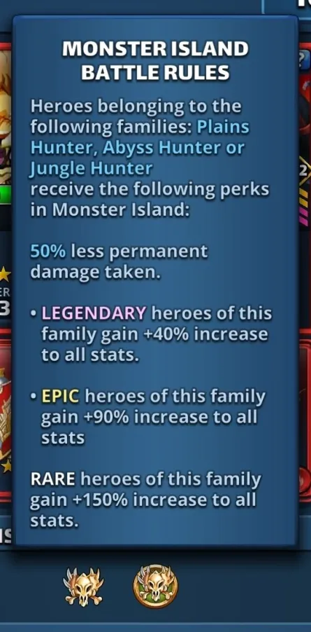 XI. Monster Island Families This section details the general bonuses of the event heroes and the specific bonuses for the different families. A. Event Heroes Bonuses (General) These enhancements apply to all designated event heroes: Statistical Enhancements (Attack, Defense, HP): Legendary: +40% Epic: +90% Rare: +150% Survival and Skill Enhancements: Permanent Damage: Heroes suffer a reduction in the amount of permanent damage received in combat. Special Skills: Their skills are enhanced, inflicting an additional ailment on all enemies. B. Family Bonuses Heroes become stronger when they are teamed with other unique Heroes of the same family. Abyss Hunter Family (Bonus : Defense) Bonus: For 1 / 2 / 3 unique Heroes: gains 10% / 15% / 20% defense. 5* Members: Otis, Goretooth, Dabria, Sorrow, Staintongue. 4* Members: Bogart, Numbskull. 3* Members: Basil, Greel. Plains Hunter Family (Bonus: Attack) Bonus: For 2 / 3 / 4 / 5 unique Heroes: gains 5% / 10% / 15% / 20% attack. 5* Members: Adalinda, Hawthorn, Cleaver, Malin, Waterpipe, Hammertusk, Ebba, Kai, Thura, Dubhán, Ruadh, Sigyn, Sune, Revna, Amund, Njal, Sorcha, 4* Members: Meadow, Maheegan. 3* Members: Edelaide, Dawn, Fianna. Jungle Hunter Family (Bonus: HP) Bonus: For 2 / 3 / 4 / 5 unique Heroes: gains 5% / 10% / 15% / 20% HP. 5* Members: Bone Breaker (Brise-os), Hurricane, Thunderclap, Mist Weaver (Tisse-brume), Tremor. 4* Members: Knuckles. 3* Members: Cedar. Titan Hunters Family (Special Bonus against Titans) Mana (Start of Battle): For 1 / 2 / 3 Heroes: Receives 10% / 15% / 20% mana. Mana (Against Titans): For 1 / 2 / 3 Heroes: Receives 40% / 60% / 100% mana. Counterattack: For 1 / 2 / 3 Heroes: Counterattacks with 125% / 150% / 175% of damage received from Titans' Special Skills. 5* Membres : Adelitza, Lumi&Taïga, Borgholf XII. Various Documents, Community Playlist OLD DOCUMENTS Credit by Cap DOCUMENTS TOP 100 Credit HeyAlexa, Ruskin505, Minko, Raj, Dom, Tobov, Alex, Fox PLAYLIST VIDEO English Général J : https://youtu.be/ZpV-LRZ61fU?si=no715F-vXqouGQ_s Combonator : 1/3 https://youtu.be/OpNVfgp3OTo?si=uu5Z5GYjagJolnwW 2/3 https://youtu.be/_xe1bdC6fDY?si=qOgm5lZBYFQgOOqk 3/3 https://youtu.be/-H6Pn4gfnq0?si=8Rat4ch1eXR3XJ4g French Zanemarossi : https://youtu.be/r6aSPZr5MKY?si=LolhDtloGzpikkky Spanish Pequena : https://youtube.com/shorts/AGx0KnTSMLo?si=Apr4-PpKCHVL6M9n Polish Navy (top 10): https://youtu.be/dEF2GhxOU-0?si=as9TJV2A4qZRIjg0