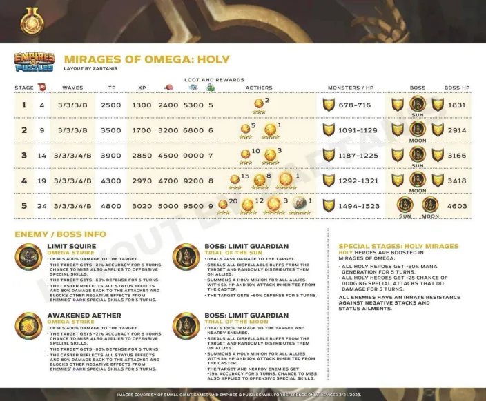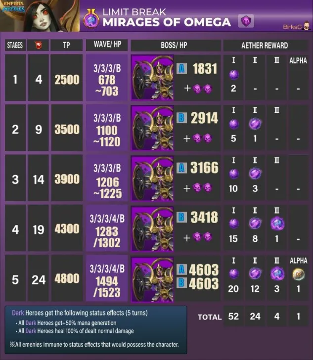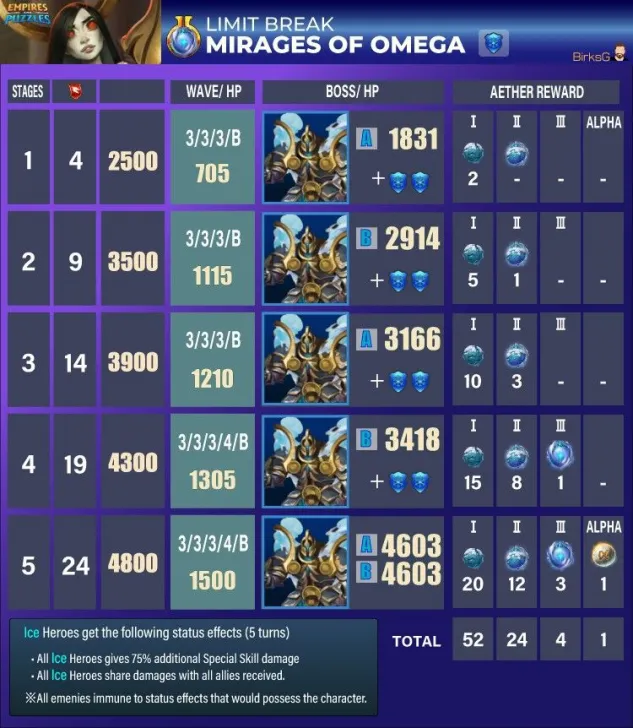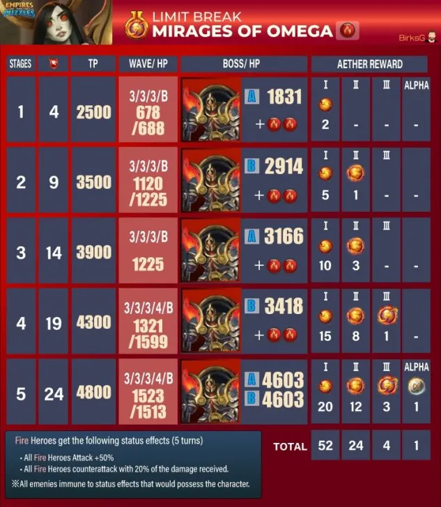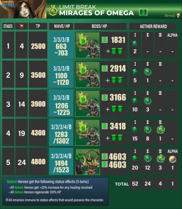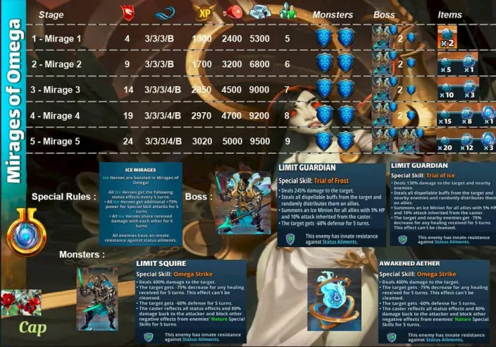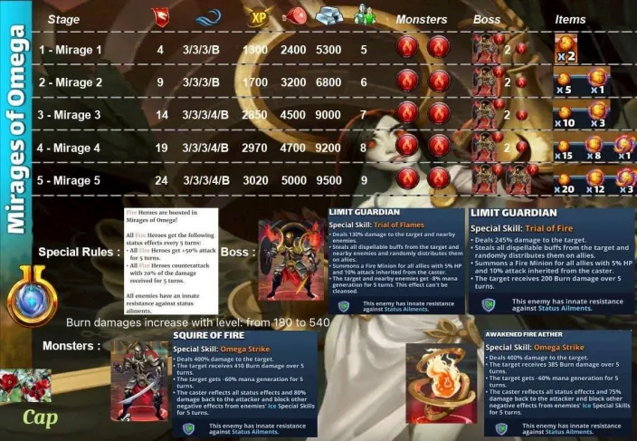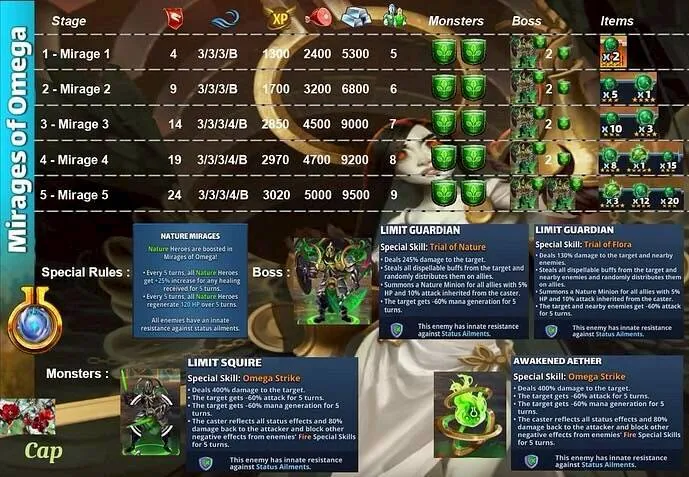 These quests are the main event for obtaining Aethers, the materials needed to surpass the heroes' stat limit and add two additional tiers of advancement. Find theLimit Break guide here : [PLACEHOLDER] 1. General Quest Structure Frequency: Every 28 days Duration: 36 hours. Focus: The quest is always focused on a single element. Rotation Quest : Fire > Holy > Nature > Ice > Dark Progression: The quest features 5 stages with increasing World Energy (WE) costs and enemy waves. 2. Stage Details A. Stage Details (Cost and Waves) Stage 1: 4 WE, 4 Waves. Suggested Power: 2500. Bosses: Type 1 + 2 Mobs. Stage 2: 9 WE, 4 Waves. Suggested Power: 3500. Bosses: Type 2 + 2 Mobs. Stage 3: 14 WE, 5 Waves. Suggested Power: 3900. Bosses: Type 1 + 2 Mobs. Stage 4: 19 WE, 5 Waves. Suggested Power: 4300. Bosses: Type 2 + 2 Mobs. Stage 5: 24 WE, 5 Waves. Suggested Power: 4800. Bosses: Type 1 + 2 Mobs. B. Specific Effects per Element (Enemies) The ailments applied by the Mobs' Omega Strike and the Bosses' Skills depend on the quest element. Trial of Fire Quest: Mobs (Omega Strike): Apply Burn damage and -60% Mana generation. Boss Type 1 (Single Target): Applies Burn damage. Boss Type 2 (Area): Applies -8% Mana generation (undispellable) to the area. Trial of Ice Quest: Mobs (Omega Strike): Apply -75% reduced Healing received and -60% Defense. Boss Type 1 (Single Target): Applies -60% Defense. Boss Type 2 (Area): Applies -75% reduced Healing received (undispellable) to the area. Trial of Holy Quest: Mobs (Omega Strike): Apply -21% Accuracy (applies to offensive Special Skills) and -60% Defense. Boss Type 1 (Single Target): Applies -60% Defense. Boss Type 2 (Area): Applies -19% Accuracy (offensive Special Skills) to the area. Trial of Nature Quest: Mobs (Omega Strike): Apply -60% Attack and -60% Mana generation. Boss Type 1 (Single Target): Applies -60% Mana generation. Boss Type 2 (Area): Applies -60% Attack to the area. Trial of Dark Quest: Mobs (Omega Strike): Apply Poison damage and -60% Defense. Boss Type 1 (Single Target): Applies -60% Defense. Boss Type 2 (Area): Applies Poison damage (490 over 5 turns) to the area. C. Special Rules per Element (Hero Buffs) Note: All enemies have an innate resistance to status ailments. Fire: Every 5 turns, Fire Heroes receive +50% Attack and Counterattack with 20% of damage received (5 turns). Ice: Every 5 turns, Ice Heroes receive +75% power for Special Skills (SS) and Share damage received (5 turns). Holy: Every 5 turns, Holy Heroes receive +50% Mana generation and 25% chance to Dodge Special Attacks (5 turns). Nature: Every 5 turns, Nature Heroes receive +25% increased Healing received and Regenerate 120 HP (over 5 turns). Dark: Every 5 turns, Dark Heroes receive +50% Mana generation and Heal 100% of damage dealt from normal attacks (5 turns). 3. Quest Rewards (Limit Breaker - L.B. Aethers) The rewards increase in quantity and rarity as you progress: Stage 1: 2x Rare L.B. Stage 2: 5x Rare L.B., 1x Epic L.B. Stage 3: 10x Rare L.B., 3x Epic L.B. Stage 4: 15x Rare L.B., 8x Epic L.B., 1x Legendary L.B. Stage 5: 20x Rare L.B., 12x Epic L.B., 3x Legendary L.B., 1x Alpha Aether. 4. Resources Guide by BirksG (EN) Guide by BirksG (JP) Guide by Zartanis Old guide by Cap (alpha aether missing) Omega Quest 2026 Credit by MissK