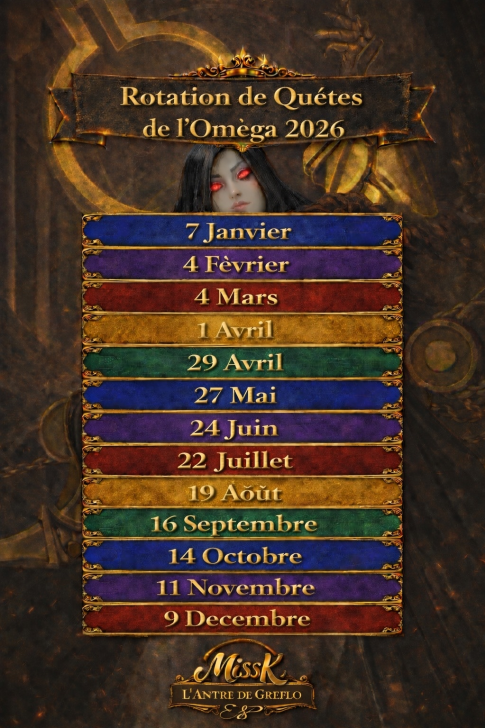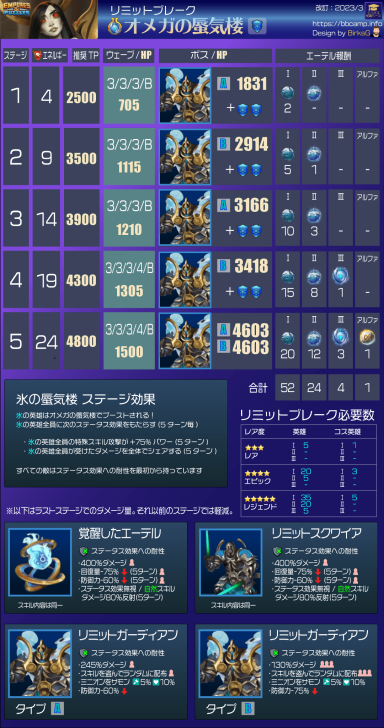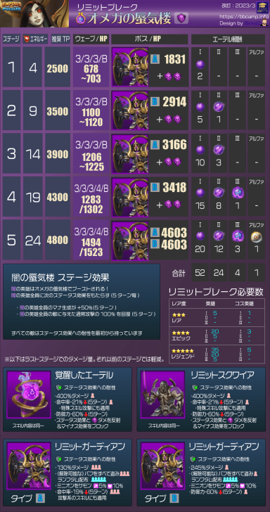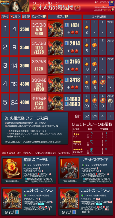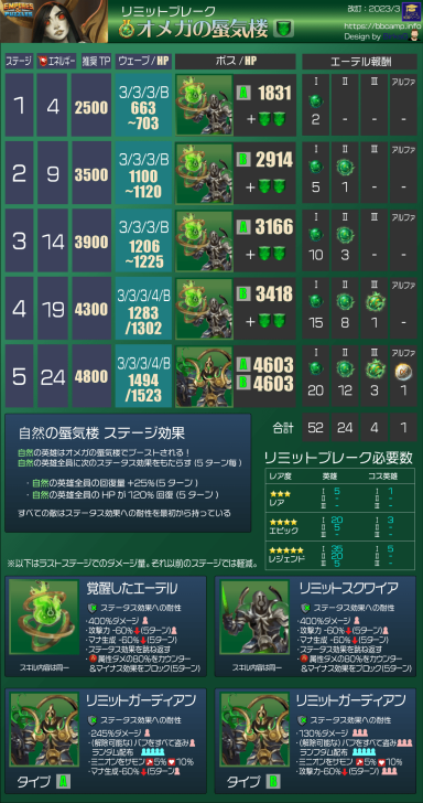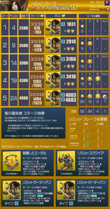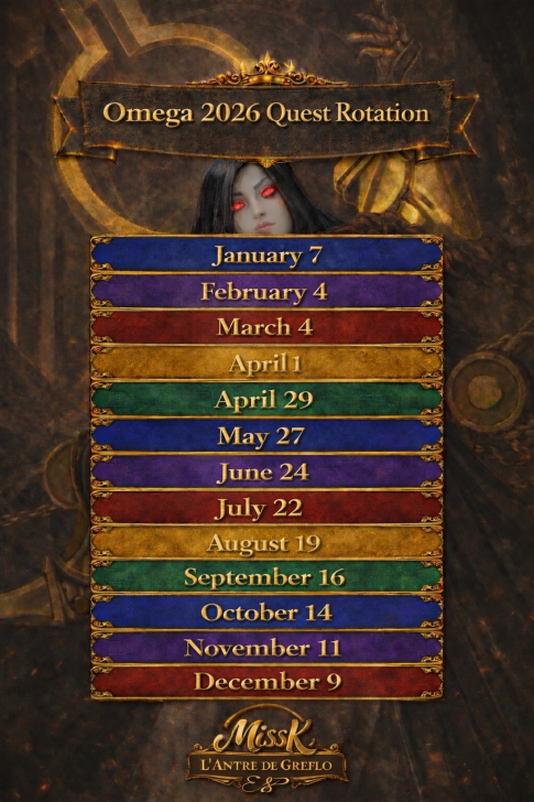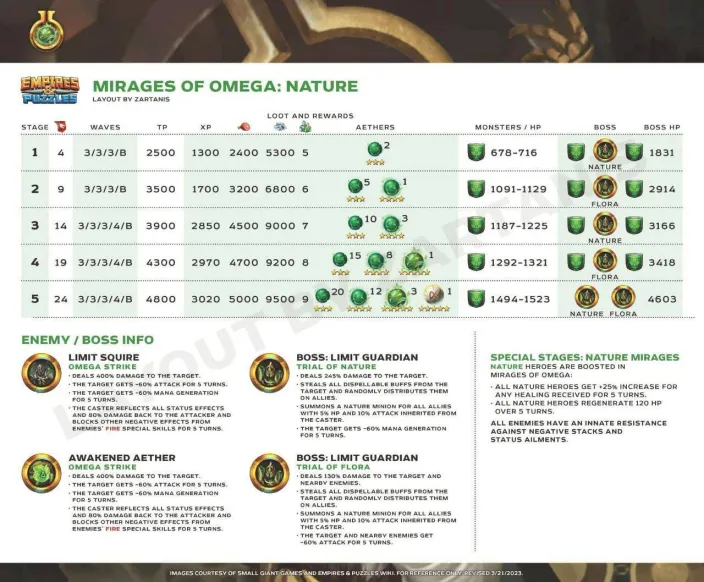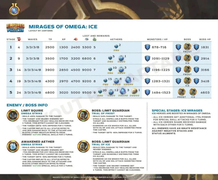 These quests are the main event for obtaining Aethers, the materials needed to surpass the heroes' stat limit and add two additional tiers of advancement. Find theLimit Break guide here : [PLACEHOLDER] 1. General Quest Structure Frequency: Every 28 days Duration: 36 hours. Focus: The quest is always focused on a single element. Rotation Quest : Fire > Holy > Nature > Ice > Dark Progression: The quest features 5 stages with increasing World Energy (WE) costs and enemy waves. 2. Stage Details A. Stage Details (Cost and Waves) Stage 1: 4 WE, 4 Waves. Suggested Power: 2500. Bosses: Type 1 + 2 Mobs. Stage 2: 9 WE, 4 Waves. Suggested Power: 3500. Bosses: Type 2 + 2 Mobs. Stage 3: 14 WE, 5 Waves. Suggested Power: 3900. Bosses: Type 1 + 2 Mobs. Stage 4: 19 WE, 5 Waves. Suggested Power: 4300. Bosses: Type 2 + 2 Mobs. Stage 5: 24 WE, 5 Waves. Suggested Power: 4800. Bosses: Type 1 + 2 Mobs. B. Specific Effects per Element (Enemies) The ailments applied by the Mobs' Omega Strike and the Bosses' Skills depend on the quest element. Trial of Fire Quest: Mobs (Omega Strike): Apply Burn damage and -60% Mana generation. Boss Type 1 (Single Target): Applies Burn damage. Boss Type 2 (Area): Applies -8% Mana generation (undispellable) to the area. Trial of Ice Quest: Mobs (Omega Strike): Apply -75% reduced Healing received and -60% Defense. Boss Type 1 (Single Target): Applies -60% Defense. Boss Type 2 (Area): Applies -75% reduced Healing received (undispellable) to the area. Trial of Holy Quest: Mobs (Omega Strike): Apply -21% Accuracy (applies to offensive Special Skills) and -60% Defense. Boss Type 1 (Single Target): Applies -60% Defense. Boss Type 2 (Area): Applies -19% Accuracy (offensive Special Skills) to the area. Trial of Nature Quest: Mobs (Omega Strike): Apply -60% Attack and -60% Mana generation. Boss Type 1 (Single Target): Applies -60% Mana generation. Boss Type 2 (Area): Applies -60% Attack to the area. Trial of Dark Quest: Mobs (Omega Strike): Apply Poison damage and -60% Defense. Boss Type 1 (Single Target): Applies -60% Defense. Boss Type 2 (Area): Applies Poison damage (490 over 5 turns) to the area. C. Special Rules per Element (Hero Buffs) Note: All enemies have an innate resistance to status ailments. Fire: Every 5 turns, Fire Heroes receive +50% Attack and Counterattack with 20% of damage received (5 turns). Ice: Every 5 turns, Ice Heroes receive +75% power for Special Skills (SS) and Share damage received (5 turns). Holy: Every 5 turns, Holy Heroes receive +50% Mana generation and 25% chance to Dodge Special Attacks (5 turns). Nature: Every 5 turns, Nature Heroes receive +25% increased Healing received and Regenerate 120 HP (over 5 turns). Dark: Every 5 turns, Dark Heroes receive +50% Mana generation and Heal 100% of damage dealt from normal attacks (5 turns). 3. Quest Rewards (Limit Breaker - L.B. Aethers) The rewards increase in quantity and rarity as you progress: Stage 1: 2x Rare L.B. Stage 2: 5x Rare L.B., 1x Epic L.B. Stage 3: 10x Rare L.B., 3x Epic L.B. Stage 4: 15x Rare L.B., 8x Epic L.B., 1x Legendary L.B. Stage 5: 20x Rare L.B., 12x Epic L.B., 3x Legendary L.B., 1x Alpha Aether. 4. Resources Guide by BirksG (EN) Guide by BirksG (JP) Guide by Zartanis Old guide by Cap (alpha aether missing) Omega Quest 2026 Credit by MissK