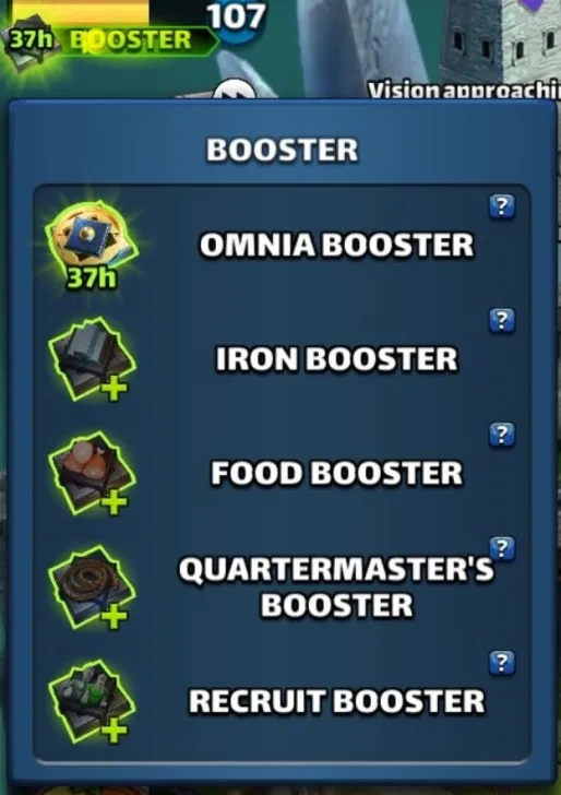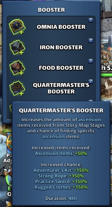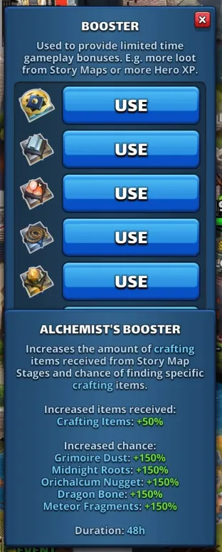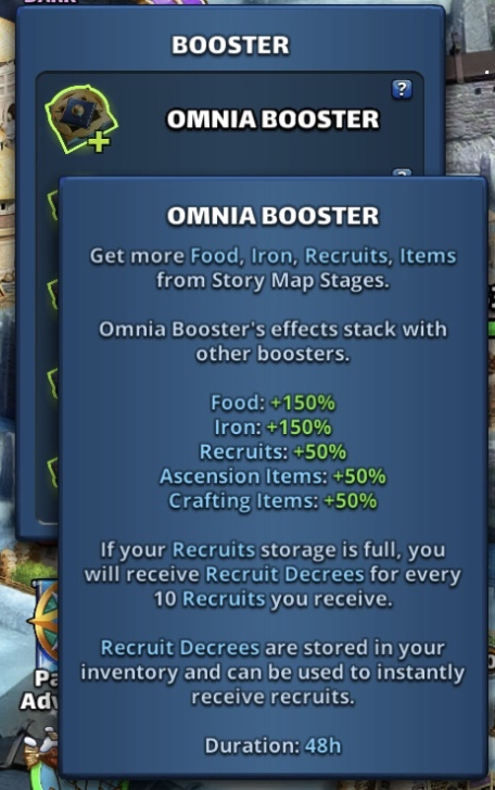 This post is a master discussion & information thread for the Boosters and Decrees added to Empires and Puzzles in Version 76 Boosters The previous name of the Boosters were Harversters, and Path of Valor has given them as reward. Experience Booster (48h) Increase experience gained when leveling up Heroes. Hero Level Up Boost: +10% Recruit Booster (48h) Get more Recruit from Story Map Stages. Recruits: +150% If your Recruits storage capacity is full, you will receive Recruit Decrees Quartermaster’s Booster (48h) Increases the chance of finding specific ascension items from Story Map Stages. Advanturer’s Kit: +150% Strong Rope: +150% Practice Sword: +150% Rugged Clothes: +150% Omnia Booster (48h) Get more Food, Iron, Recruits, Items from Story Map Stages. Food: +150% Iron: +150% Ascension & Crafting Items: +50% Recruits: +50% If your Recruits storage capacity is full, you will receive Recruit Decrees. Food Booster (48h) Get more Food from Story Map Stages. Food: +300% Iron Booster (48h) Get more Iron from Story Map Stages. Iron +300% Alchemist’s Booster(48h) Increases the chance of finding specific crafing items from Story Map Stages. Grimore Dust: +150% Midnight Roots: +150% Orichalcum Nugget: +150% Dragon Bone: +150% Meteor Fragments: +150% How to use them ? Boosts can be activated either by clicking “Use” in your inventory or selecting the boost icon beneath your avatar. When inactive, a boost appears grayed out in the list under Blackened Cataract. Once activated, its infographic becomes fully visible, displaying the remaining duration. Since version V80, multiple boosters can now be activated simultaneously. Additional boost rewards are highlighted with a green outline. Recuit Decrees These are resource bundles for Recruits. (Large) Recruit Decree Insantly gain 100 Recruits. (Medium) Recruit Decree Insantly gain 50 Recruits. (Small) Recruit Decree Insantly gain 10 Recruits. Decree creation is possible with the Recruit Booster and the Omnia Booster. Decree creation is limited to 100 recruits per day and triggers automatically when the recruit gauge is full. The number of recruits gathered per level determines how many decrees are issued. If fewer than 50 recruits are collected at once, Decree 10 will handle the creation.