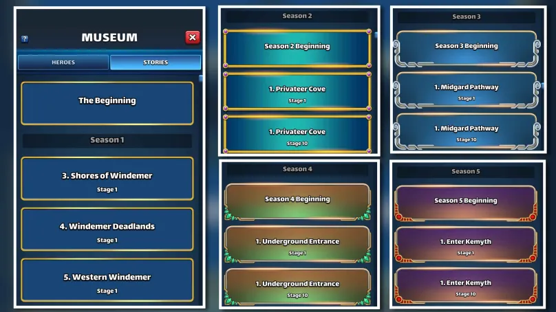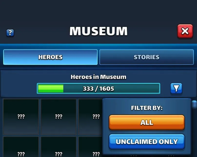 This topic covers the Hero Museum, a Stronghold feature that rewards players with Gems for every Hero or Costume that reaches its base maximum level. Furthermore, this feature grants access to the Story of the first 5 Seasons of the game. 1. Accessing the Museum The Hero Museum is a new entrance located in your Stronghold. Unlocking: It is automatically unlocked above Stronghold Level 5. Construction: You do not need to build or upgrade it. 2. Heroes Tab: Collection and Rewards This tab lists all the heroes and costumes you have leveled to their maximum and grants you rewards. A. Criteria for Collection - A hero/costume is permanently added to the collection if it is leveled up to its basic maximum level. - Limit Breaking or Emblems are NOT displayed on the museum card. - The list is incremented as new heroes are published in the different portals. - It is not possible to preview the location of heroes not currently in your roster. B. Gem Rewards You collect gem rewards based on the character's rarity: 1* Heroes: 1 Gem 2* Heroes: 2 Gems 3* Heroes/Costumes: 3 Gems 4* Heroes/Costumes: 5 Gems 5* Heroes/Costumes: 10 Gems Note: A notification icon on the Museum building indicates there are gems ready to be collected. C. Usage, Display, and Filters Display: The Museum allows you to view the hero's card at their max level (basic max level). Usage: Heroes added to the Museum can still be used (the Museum does not lock them). Progress: Unmaxed characters are grayed out. Clicking on them shows the progress of their leveling. Available Filters: The museum allows filtering to display: All Heroes Uncollected (those for which you have not yet collected the gems) 4. Community Feedback The feature is appreciated for the free gems it provides initially. Some players feel that, once the rewards are collected, its usefulness is limited to being a collection display.