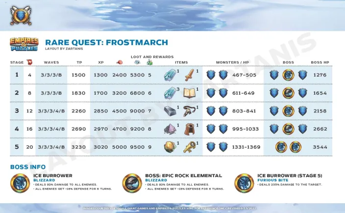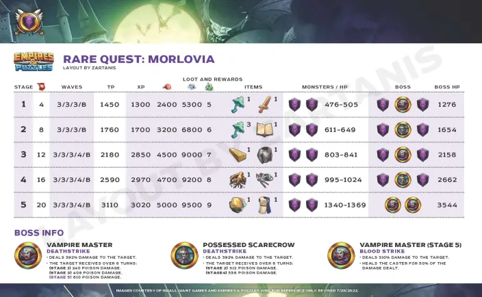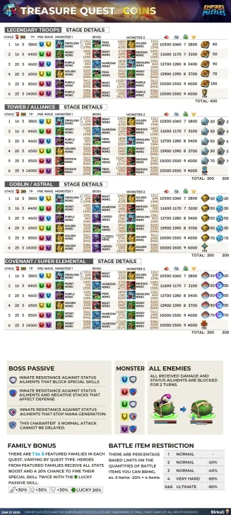 Credit by PlayForFun This is a 5 day long Alliance Quest with 10 stages. Musketeer and Beauty and the Beast heroes in Alliance Quests As in other similar events the event heroes in the current event have a bonus when they are used in the The Brave & The Beautiful Alliance Quest. Alliance Quest Rules he goal of an Alliance Quest is to get high Alliance Quest Score. The Alliances with the highest Alliance Quest Scores win exclusive loot at the end of the event. Alliance Quest Score is the combined score of all players in all stages and Difficulty Tiers. Stages can be replayed for the best possible score. The score from each stage is defined by the enemies defeated, speed of completion and the amount of Hero health left at the end of a stage. Big combos and great matches are also taken into account. Using Continues has a negative effect on the stage score. The different Difficulty Tiers have limits on what Heroes, Troops, and Battle Items can be used in the fights. In Alliance Quest, the harder Difficulty Tiers are unlocked with Alliance Quest Score. Specifically: Heroes of the Musketeer and the Beauty and the Beast families bypass the Elemental Barriers, and have increased attack, defense, and health (+20%) in this Alliance Quest’s stages Some Notes: This bonus ONLY applies to Musketeer and Beauty and the Beast Family Heroes IN theThe Brave & The Beautiful Event. It is NOT limited to Unique heroes only... Any and all featued family heroes gain the bonus stat boost. 1. Difficulty unlocking limits Only the Alliance members that joined the Alliance before the Alliance Quest started can participate. Epic difficulty is unlocked when your alliance is reached 2 500 000 points in total. Legendary difficulty is unlocked when your alliance is reached 10 000 000 points in total. 2. Event Info -- Stages, Bosses, and WE Cos There are no Suspicious chests in the event so the only way to get coins is by completing the Quest for the first time. The Brave & Beautiful follows the the usual set-up for Challenge Events with 3 difficulty tiers (Rare, Epic & Legendary); It is however, Like LoV and Starfall Circus and Slayers, using the old format of only 10 Stages for each tier. 3. Special Gameplay A. Special tiles (All For One!) When you combine 4 shields, then instead of Dragon Shield a Musketeer Shield will appear. If you match that Musketeer Shield, then it explodes like a normal Dragon Shield, and clears 4 additional tiles (1-1 left, right, down, up), plus is dispels buffs from all enemies. When you combine 5 shields, then instead of Power Shard an Elite Musketeer Shield will appear. If you match this Elite Musketeer Shild, then it explodes then it takes out all shields to in the same line and row, and it also dispels buffs from all enemies. If you do not match them immediately then the damage from Musketeer Shields and Elite Musketeer Shields are increasing with 20% every turns until it reaches 200%. If you match these special Shields, then the buffs will be dispelled from enemy before the troops reaching the enemy. (So you heroes will not be receive damage from counterattack for example if the enemies had that buff before you fire these specail tiles.) B. Special Gameplay : Fortification All enemies get the following status effects every 5 turns: All damage enemies get +30% defense for 3 turns. All enemies counterattack with 100% of the damage received for 3 turns. 4. Event Hero Bonus Gain additional perks in the battles by using the Heroes of this Alliance Quest ! Heroes of the Musketeer and the Beauty and the Beast families bypass the Elemental Barriers, and have increased attack, defense, an health in battles ! THE BRAVE & THE BEAUTIFUL EVENT EFFECTS All for One ! In this quest, Musketeer Shields, and Eline Musketeer Shields appear in place of Dragon Shields and Power Shards. The Shields power increases each turn and also dispel enemies' buffs when matched. 5. Summoning Odds As with all other challenge events, the The Brave & The Beautiful comes with it's own Summon Portal. See below for information regarding the appearance rates. The portal contains the Musketeer and Beauty and the Beast heroes. Featured heroes for the 1st occurence: The Beast Rose de Flo Aramis + Costume A. Appearance Rates Rare Classic Hero: 47.3% Epic Classic Hero: 18.5% Legendary Classic Hero: 1.2% Rare Event Hero: 23.7% Epic Event Hero: 8.0% Legendary Event Hero 0.3% Legendary Featured Hero 1.0% (Costume included if available) BONUS DRAW Legendary Hero of the Month: 1.3% B. Alliance Quest Coins and Summon Cost The "The Brave & The Beautiful" makes use of a same Alliance Quest Coins currency for summoning as other alliance quests. There is no Suspicious chests in the event. You only 10 of them for a Summon or 350 gems. You can do a 10 pull with 3000 gems. 6. Rewards Brave & Beautiful has the same rewarding system as other alliance quests. The scores for all tiers are adding up into a single number, and you receive the loot based on your individual tier and the tier where your alliance's combined score is in. Instead of instant Tier Completion Rewards you can open a chest after you complete a Tier. Example chest rewards: Rare Chest: 1x Clean Cloth, 1x Chainmal Shirt, 1x Super Antidotes, 2x Alliance Quest Coin Epic Chest: 1x Crude Iron, 1x Sturdy Shield, 1x Super Antidotes, 3x Alliance Quest Coin Legendary Chest: 1x Meteor Fragments, 1x Orb of Magic, 1x Dragon Attack, 5x Alliance Quest Coin Once you finish a tier the next tier will not be automatically opened, and you need to open the chest manually. Guide for the Quest can be seen in the first post. Credits to BirksG