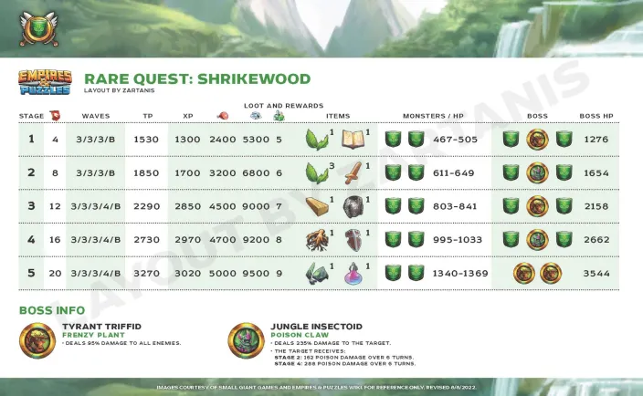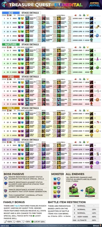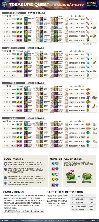 Credit by PlayForFun This is a challenging quest with rotating high-value loot rewards, such as Aether Crystals and Legendary Troop Coins. Special Rule: Featured Families Families with bonuses for this quest: Featured Family Bonus: +30% attack +30% defense +30% health. Lucky ! Passive Skill: A chance to cast the Special Skill of this hero 2 times. Mimics This quest features Mimics who can shield themselves by casting their Special Skill. Battle Item Usage Limitation Instead of hero usage limitation there is a limitation of battle item usage llimitation. You can always bring at least 1 battle item on every stage. Guide By BirksG The first stage has no limitation. The second stage has a 20% limitaiton. So instead of 5 you can bring 4 battle items for specific battle items, or you can bring only 8 if you could use 10 on stage 1. The third stage has a 40% limitaiton. So instead of 5 you can bring 3 battle items for specific battle items, or you can bring only 6 if you could use 10 on stage 1. The forth stage has a 60% limitaiton. So instead of 5 you can bring 2 battle items for specific battle items, or you can bring only 4 if you could use 10 on stage 1. The fifth and sixth stage has a 80% limitaiton. So instead of 5 you can bring 1 battle items for specific battle items, or you can bring only 2 if you could use 10 on stage 1.