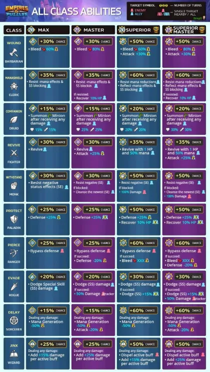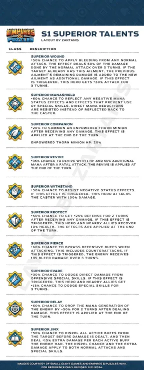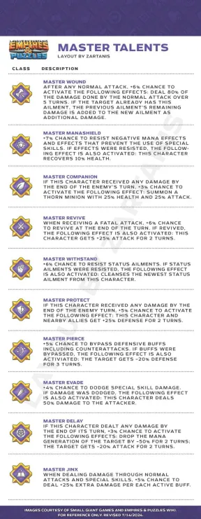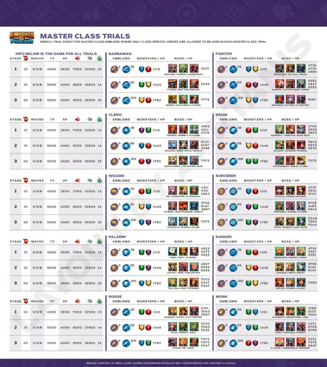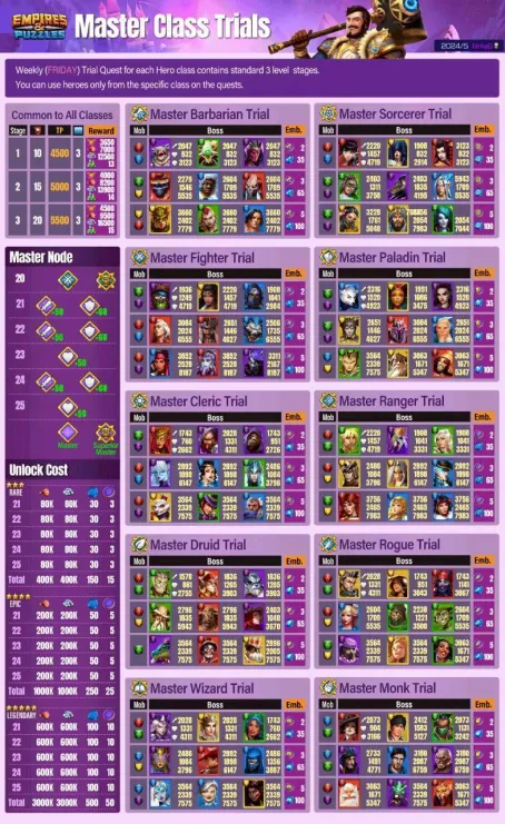 Master information thread for the Master Emblems, Master Talents, Superior Master Talents Emblems The emblem is a resource that allows you to strengthen a hero's statistics and grant them an ability linked to their class. The cost of evolution in resources increases as the levels progress. This Subject will be developed later Master Talents / Superior Talents Master Emblems can be used to further emblem your heroes with 5 additional levels, which is unlocked if your hero is already has 20 emblems. There is a specific Master Emblem for each existing Hero class. Master Emblem nodes can be substituted by a single Golden Emblem like the normal talent nodes. Similarly to Golden Emblems, Master Class Emblems will not be returned when the Talent Grid is reset. The new talent nodes give Stat boost, and when you reach the 25th node, then your non season 1 hero will get a Master Talent, and Season 1 heroes are getting Superior Master Talent. See the desripton of these Master and Superior Master Talents in the next sections. Master Talent Layout Here is the Layout for Master Talent nodes. Master Talent Node Costs Each new talent node gives these stat boosts at the bellow cost. Each node cost food, iron and class specific Emblems and Master Emblems for the specific class. Rarity Node / Stat Boost / Food Cost / Iron Cost / Emblem Cost / Master Emblem Cost Common Uncommon Rare Epic Legendary Master Talents and Superior Master Talents When a Season 1 heroes and costumes receive his/her 25th Talent node, then that hero gets the Superior Master Talent while other heroes get Master Talent Talent skill description details Barbarian Cleric Druid Fighter Monk Paladin Ranger Rogue Master Class Trials and other Master Emblem sources Master Emblems can be acquired from Master Class Trial Quest. These trials are standard 3 level Quests. Each level can be played once. There is a Master Trial Quest for each Hero class. So there are 10 variations. You can use heroes only from the specific class on the quests. There is no further limitation. Prediction quest rotation Barbarian > Fighter > Cleric > Druid > Wizard > Sorcerer > Paladin > Ranger > Rogue > Monk (05/2024) Season 1 heroes by class for superior talent Barbarian Cleric Druid Fighter Monk Paladin Ranger Rogue Sorcerer Wizard GUIDES Guides by Zartanis, BirksG