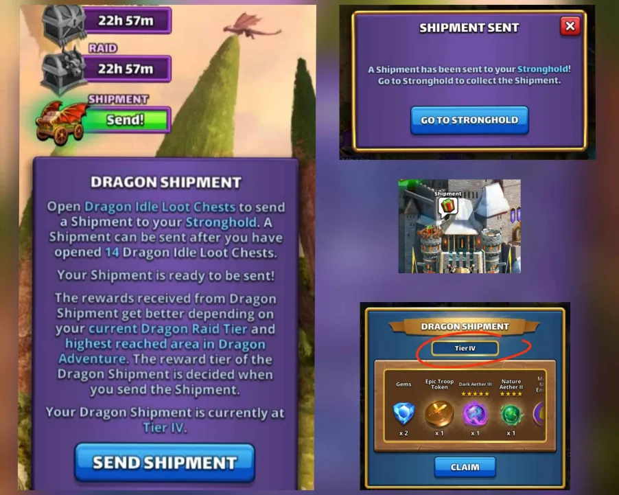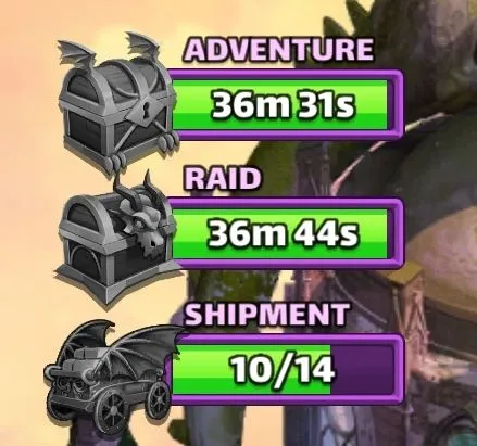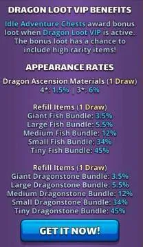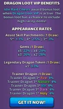 This thread is to provide early insights and discussion on the new Dragonspire Wanted Missions Dragonspire Wanted Missions There are two Wanted Missions in the Dragonspire game mode. Adventure Chest Raid Chest Idle Adventure Chest It generates idle rewards over time. After 24 hours, the chest has generated the maximum amount of rewards and can be opened. Before the 24 hours has passed, the chest cannot be opened. Rewards are based on the highest province you have reached on Dragon Adventure. Example Loot Idle Raid Chest It generates idle rewards over time. After 24 hours, the chest has generated the maximum amount of rewards and can be opened. Before the 24 hours has passed, the chest cannot be opened. Rewards are based on your current Dragon Raid Arena. Example Loot Dragonspire Loot VIP Dragon Loot VIP gives you bonus loot from Idle Chests for as long as the VIP is active. Multiple purchases of the Dragon Loot VIP extend the duration automatically. Purchases are limited to a maximum duration of 395 Days. The VIP’s duration is 30 Days. It gives you: 300 Gems on purchase Bonus loot from Idle Adventure Chests** Bonus loot from Idle Raid Chests The bonus loot has a chance to include high rarity items. Chances for Dragon Loot Vip Benefits Idle Adventure Chest Gain valueable bonus loot from Idle Adventure Chest! The bonus loot has a chance to to include high rarity items! Ascension materials / Fish Bundle / Dragonstone Bundle Gain valueable bonus loot from Idle Raid Chest! The bonus loot has a chance to to include high rarity items! Idle Raid Chest Ascension Skill Parchment / Gems / Legendary Dragon Token / Trainer Dragon Dragon shipment Open dragon idle loot chests to send a shipment to your stronghold. A shipment can be sent after you have opened 14 dragon idle loot chest. Your shipment is ready to be sent. The rewards received from dragon shipment get better depending on your cureent dragon raid tier and highest reached area in dragon aventure. The rewards tier of the dragon shipment is decided when your send the shipment. Your loot rank identification is indicated when you click on the chest. It is also indicated on the reward when opening the gift symbol on one of the castle towers. Opening idle chests is part of the Path of Dragon missions. GUIDES Rewards tiers of Dragon Shipment by Elioty, MrChief, Heyalexa