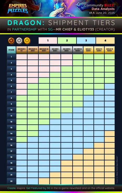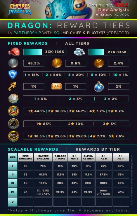 Master discussion & information thread for the Dragon Hearts feature, added to Empires and Puzzles in Version 78. Commend Dragons You can gain Dragon Hearths by commending Dragons after they are fully ascended and leveled up. To commend a Dragon select a dispensable Dragons that you want to consume. When you have collected enough Dragon Hearts you automatically get a reward. Commending Dragons follow similar rules as leveling Dragons. Commending higher rarity Dragons earns you more Dragon Hearts but costs more resources. Dragon Hearts progress is shared among all Dragons. You need 5000 Dragon Hearts to get rewards, which is a Legendary Dragon Token in Beta. Commending can be started from fully leveled dragon regardless of rarity by clicking on the Commend button in an opened Dragon’s card. Fish required is required for each selected Dragon, which is different per rarity and leveling state. If you have enough Fish, then you can commend enough dragons to get multiple rewards. The usual autofill option is available here too. Input Dragon / Heats Received / Fish required