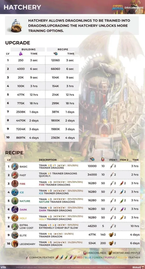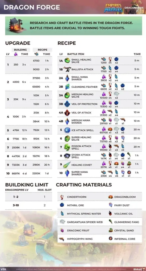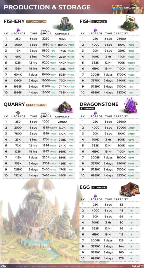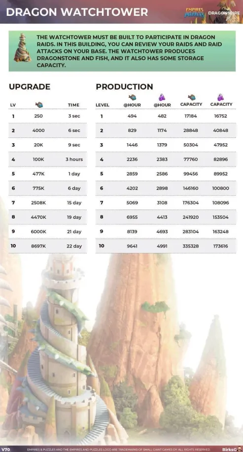 This thread is to provide early insights and discussion on the new Dragonspire Buildings Overview and each bulidings itself (Watchtower, Storage buldings, Hatchery, Dragon Forge, Quarry and Fishery) The following 9 buildings are availabe in Dragonspire Each building have exactly 10 levels. You can place buildings in a similar way to a fortress. There is a limit to the number of buildings you can place depending on the level of your Dragonspire. There are no other building such as ""Mystic Vision Tower"" in Dragonspire view. The second builder from VIP pass is applies here too. Speedups can be used to reduce crafting, training and building times. List of new available Dragonbase buildings Dragonspire The base of operations of your Dragon empire. Watchtower Watchtower stores the resources collected from captured Outposts and you can capture more to increase the production rate. The storage capacity is only used by the Watchtower. Storage Buildings Dragonstone Storage A building used to store Dragonstone. The storage capacity adds to the base maximum capacity. Egg Storage A building used for housing Dragonlings. The storage capacity adds to the base maximum capacity. Fish Storage A building used to store Fish. The storage capacity adds to the base maximum capacity. Production Buildings Fishery A building that produces Fish. The storage capacity is only used by this building. Quarry A building that produces Dragonstone. The storage capacity is only used by this building. Dragon Forge A building where various Dragon Battle Items can be crafted. Hatchery Hatchery allows Dragonlings to be trained into Dragons. Dragonspire Credit by BirksG The base of operations of your Dragon empire. Similarly to Stronghold this building has storage capacity too: 10000 Fish 10000 Dragonstone 30 Dragonlings Upgrading the Dragonspire unlocks more are for buildings and increases the maximum level for their upgrades. None of the others building can have higher level than the Dragonlings. Total numbers of Buildings per type Watchtower: 1 Dragon Forge: 2 Dragonstone Storage: 3 Egg Storage: 3 Fish Storage: 3 Fishery: 3 Hatchery: 3 Quarry: 2 Maximumum storage capacity of your base: Fish: 10 Million Dragonstone: 10 Million Dragonlings: 558 Watchtower Credit @BirsG Watchtower stores the resources collected from captured **Outposts** and you can capture more to increase the production rate. The storage capacity is only used by the Watchtower. This building is similar to the Watchtower in the Regular base. If you wish to participate in dragon raids, you must construct this building, because without it, dragon raids and dragon raid energy are disabled. You can view your raids and attacks carried out on your base in these buildings. You can avenge successful attacks against your base and view the teams used for each raid. This building produces dragon stone and fish, and it has some storage capacity. The storage capacity is used solely by the Watchtower. You can collect the dragon stone and the fish produced once per hour. As in season 1 of the normal game, at the end of each zone there is an outpost, and each one increases production by 5%. There are 22 zones, but we probably only have 21 outposts, so the maximum production increase is +105%. buildings related to storage There are three buildings classified as warehouses. Credit by BirksG Dragonstone Storage A building used to store the Dragon Stone . Its storage capacity is added to the base maximum capacity. You have a total of 3 dragonstone warehouses in your base. 1 starting from level 1 of the Dragonspire building 2 starting from level 2 of the Dragonspire building 3 when viewed from level 6 of the Dragonspire building Egg preservation Building used to house dragonets. Its storage capacity is added to the base maximum capacity. You have a total of 3 egg storage slots in your base. 1 starting from level 2 of the Dragonspire building 2 starting from level 6 of the Dragonspire building 3 when viewed from level 10 of the Dragonspire building Fish preservation A building used for fish storage . Its storage capacity is added to the base maximum capacity. You have a total of 3 fish storage units in your base. 1 starting from level 2 of the Dragonspire building 2 starting from level 3 of the Dragonspire building 3 when viewed from level 10 of the Dragonspire building Production-related buildings Credit by BirksG Fishery A fish production building . The storage capacity is used exclusively by this building. You have a total of 3 fisheries in your base. 1 starting from level 1 of the Dragonspire building 2 starting from level 3 of the Dragonspire building 3 when viewed from level 10 of the Dragonspire building Career Building producing dragon stone . Its storage capacity is used exclusively by this building. You have a total of 2 careers in your base. 1 starting from level 1 of the Dragonspire building 2 starting from level 3 of the Dragonspire building Dragon Forge Credit by BirksG A building where various items for fighting dragons can be crafted . The first 4 levels allow you to unlock the crafting of two different combat items. You can find the effect of handcrafted combat items in the Dragon Inventory topic: (placehorder) You have a total of 2 Dragon Forges in your base. 1 starting from level 1 of the Dragonspire building 2 starting from level 3 of the Dragonspire building Hatchery Credit by BirksG The hatchery allows you to train dragonets to becomedragons. La mise à niveau de l'incubateur débloque davantage d'options de formation. Le niveau 10 de l'écloserie débloque le bouton « Tout réclamer » pour toutes vos écloseries. Vous disposez d'un total de 3 incubateurs dans votre base. 1 en commençant par le niveau 2 du bâtiment Dragonspire 2 en commençant par le niveau 6 du bâtiment Dragonspire 3 vu du niveau 10 du bâtiment Dragonspire Écrit par Playforfun Guides de crédit par BirksG