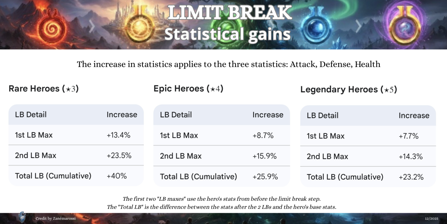 This overview details Hero enhancements allowing them to progress beyond their usual maximum level (Rare: level 50, Epic: level 70, Legendary: level 80). Last updated: June 10, 2023. Table of Content 1. Overwiew Limit Break 2. Limit Break Costs 3. Evolution Tomes 4. Aether Power 5. Ether Reset Token 6. Playlist Videos 7. Other Document 1. Overview Limit Break The feature was introduced in June 2021. The Second Limit Break, introduced in March 2023, unlocks the new passive skill "Aether Power". A. How Limit Break Works Using Ether materials unlocks the hero's maximum level. It is symbolized by a pink tier. Each Limit Break unlocks 5 additional levels. Post-unlock: The hero must be trained as usual, but requires Iron and Ascension/Improvement Materials in addition to food and EXP. Note: Certain Evolution Tomes allow you to save on some items or resources. See the relevant chapter. The LB allows for a stat increase for the hero. The total increase applies to all three stats (Attack, Defense & HP). At the 2nd LB, the Ether Power function is unlocked at the maximum level. It grants a skill bonus for 6 turns for the hero. B. Ether Materials There are three tiers of Ether for each Element : Aether I, Aether II, Aether III. Alpha Aether is a material required only for the second LB. Aethers must match the hero's attribute (element). C. Obtaining Ethers Aether can be obtained via: Omega Mirage Quest Aether Summon Raid Tournament ranking rewards. Alliance War Chest Participation in the War Chest of a minimum of 80% guarantees the obtaining of 2 Alpha Aether. Rare Quest Chests (Elemental) 2 Alpha Aether are guaranteed. Titans On Bounty Titans, achieving Rank C gives a chance to obtain an Alpha Aether as extra rewards: 3 rolls on Classic Titans, 4 rolls on Rare Titans Mystic Vision Dragon Delivery (Probabilities by delivery level). According to [MrChief's Infographic] Aether Chest Hero (Quest and Season Rewards Probabilities) Alpha Ether: 0.01% AE I: 0.9% AE II: 0.4% AE III: 0.03% Various Path of Giants Chests, Valor Chests, Summon Gate Chests, Event Rewards, etc. 2. Limit Break (LB) Costs A. Material Costs B. Food/Iron Costs These costs apply to the 5 levels unlocked after each Limit Break. C. XP Costs The experience (EXP) required to progress from one level to the next in the +5 advanced levels after Limit Break is: D. Others documents . 3. Evolution Tomes Evolution Tomes, whether specific or not, allow your heroes to gain levels while saving basic resources (Food, Iron, and Experience). Epic Experience Tome Advantage: Adds 1 level to the hero. Note: This Tome is less effective after Limit Break, as it normally adds 5 levels for a hero. Legendary Experience Tome Advantage: Adds 5 levels to the hero. Note: This Tome is less effective after Limit Break, as it normally adds 80 levels for a classic hero. Limit Break Tome I Advantage: Allows the hero to pass the First Limit, moving them to the first post-LB evolution stage, without requiring Ether materials or other ascension costs. Major Type (Element) Experience Tome Advantage: Adds 5 levels for a hero of the corresponding element. 4. Aether Power (Unlocked after 2nd LB max) All Aether powers are dispellable and activate at the start of the battle after a hero has reached level 90 and Aether level 10. In battles with multiple waves, its effect is applied from the beginning of the first wave. Aether Power is a passive skill that activates for 6 turns at the start of every battle. Power & Description Defense & Damage Mitigation 1. Bulwark: Gains +15% defense, with additional defense stacking over 6 turns. 2. Defense Up: Gains +20% defense for 6 turns. 3. Special Armor: Gains +30% defense against special skills for 6 turns. 4. Damage Reduction: Reduces all incoming damage by 10% for 6 turns. 5. Knight’s Endurance: 30% chance to reduce received damage to 1 for 6 turns. 6. Dodge: 20% chance to dodge special skill damage for 6 turns. Control & Protection 1. Taunt: Forces enemies to target this hero with special skills, protecting allies for 3 turns. 2. Fiend Resist: Immune to new fiends for 6 turns. 3. Ailment Immunity: Immune to new status ailments for 6 turns. 4. Ailment Reflect: Reflects cleanseable status ailments back to enemies for 6 turns. Survivability & Recovery 1. Regen: Regenerates 420 HP over 6 turns. 2. Heal Increase: Receives +50% healing from all sources for 6 turns. 3. Vampirism: Heals 100% of normal attack damage dealt for 6 turns. 4. Revive: If defeated within the first 4 turns, revives with 1 HP (all effects removed). Offense & Counter Pressure 1. Counterattack: Counterattacks for 60% of damage received for 6 turns. 2. Rage: Gains +15% attack, with additional attack stacking over 6 turns. 3. Gamble: Gains +50% attack with -20% accuracy for 6 turns. 4. Special Boost: Special skill deals +30% damage for 6 turns. Utility Mana Boost: Gains a small amount of mana over 6 turns. Infographic by Zartanis Nynaeve . 5. Arther Reset Token The Aether Reset Token is an extremely rare item that allows you to completely undo a Hero's progression. Reset Functionality This token acts similarly to the Talent Reset Emblem: It completely reverses the Hero's progression. It resets their Limit Break levels and their Talent Grid. Items Restored When used, the token restores: All items consumed during power-up (Aethers, Emblems, etc.). 50% of the Food and Iron spent (with a cap of 100 million). The Trainer Heroes consumed. Availability This token is not available in the game as a reward or in offers. Three copies were distributed to players in May 2023 to compensate for a major imbalance that occurred during Update 58. It may be granted exceptionally on an individual basis as compensation for a hero significantly modified by the developers after release.