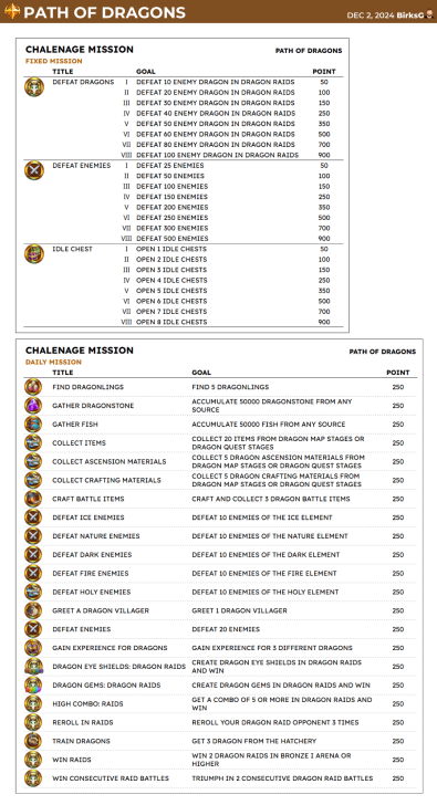 The Path of Dragons is a new game event, which is similar to Path of Valor It's a a 28 day long event similarly to Path of Valor, during which there are Daily Challenges and Dragon Challenges. This is not a Stage-based Event, unlike Challenge Events and Seasonal Events. It's about completing Challenges in various parts of the game. There isn't new playable World Map/Quest content. Completing these Challenges will earn you Path of Dragons Points, which unlock rewards. Path of Dragons has two sets of rewards: Free and Premium rewards. Premium rewards are unlocked when Path of Dragons Pass is activated — and requires purchase. Daily Challenges Daily Challenges change every day. You only have 24 hours to complete them. Dragon Challenges Dragon Challenges are active for the whole duration of the Path of Dragons. Dragons Challenges are Tiered: completing one Dragon Challenge will reveal the next Tier of that challenge. Path of Dragons Points Challenges give you Path of Dragons Points. Path of Dragons Points are needed to reach Milestones on the Path of Dragons . Milestones Each Milestone can have Normal Rewards and Premium Rewards for you to collect. Premium Rewards are only available for the players with an active Path of Dragons Pass. Frequency of Path Dragons Path of Dragons runs for 28 days total. The Path of Dragons will starts immediatelly ater the previous Path of Dragon ends. Uncollected rewards from the previous Path of Dragons will automatically be saved and awarded to the player when they next access their Path of Dragons menu.