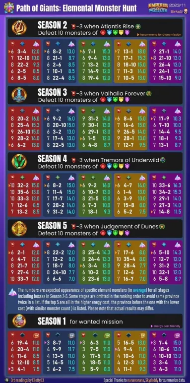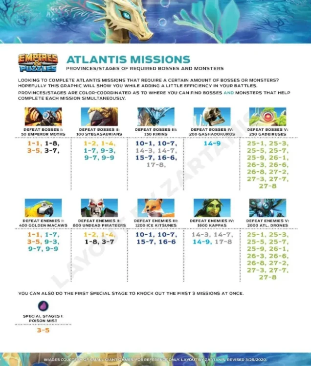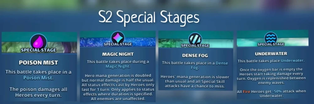 This thread compiles the essential information regarding Season 2 of the game, titled Atlantis , which was initially launched in August 2018. Table of Contents How to access the Event Stages Missions Atlantis Coins Summon Portal The Atlantis Families Resources 1. How to Access the Event Where to find it: Access is via the Seasons tab. Prerequisite: You must have completed up to Stage 15 of Season 1. Base Season: It is available permanently. Frequency (Summoning Portal): It is part of a 4-day rotation among several reduced-cost seasons: S2 > S3 > S4 > S5 > UT1 > UT2. Relive the season at a reduced cost, particularly appreciated for farming due to the double rewards for levels completed: 2. Stages A. General Overview Season 2 is divided into 27 provinces of 10 stages that unlock as you progress. It features an Easy Mode and a Hard Mode, a new feature compared to season 1. Hard mode is only accessible once Easy mode is completed. The required World Energy varies throughout the provinces from 6 to 10 (Easy) and 10 to 15 (Hard). Each stage is divided into waves (varying from 3 to 5 waves) featuring monsters and final bosses similar to other seasons. B. Stage Properties With season 2, special stages were introduced. Some levels feature special effects. Poison Mist (P1-3, P13-15, P19-21) The poison damages all heroes every turn Magic Night (P4-6, P19-21) Hero mana generation is doubled but normal damage is half the usual. All status effects cast by heroes only last for 1 turn. All enemies are unaffected. Dense Fog (P7-9), P16-21) Mana generation is slower than usal and all special attacks have a chance to miss. Undewarter (10-13, P22-27) Once the oxygen bar is empty the heroes start taking damage every turn. Oxigene is replenished between enemy waves. All Fire heroes get reduced attack when Un derwater. Unique Boss The Unique Boss heals itself and buffs are dispelled from the Heroes every 5 turns. 3 3. S2 Missions Specific missions allow you to earn Gems or Avatars. Special Stages Enemies Missions Bosses Missions Special Unique Enemies Guide to Stages for Avatar Missions by Zartanis, Ramay Bolton 4. The Atlantis Coins This is the exclusive currency for summoning Season 2 heroes. Acquisition: They are rewarded the first time you complete a map stage. Amount: Easy Mode gives 3 coins per stage. Hard Mode gives 5 coins per stage. Summoning: 100 Atlantis Coins are required for one free summon. 5. Summon Portal Summon Cost 1 Summon: Costs 350 Gems or 100 Atlantis Coins. 10 Summons: Cost 3000 Gems. 30 Summons: Cost 8400 Gems. Each summon in the portal credits a summoning chest. Every 10 summons, the retrieved chest grants rewards. You can only obtain a maximum of 12 chests per session. Appearance Rate Heroes from three groups are present: Season 2 heroes. HOTM selection Season 1 heroes (without their costumes). Each month there are two Legendary Atlantis heroes that are featured heroes 6. Atlantis Families Heroes become stronger when teamed with other unique Heroes of the same family. A. Atlantis Family Bonus for 1/2/3/4/5 Heroes: 5%/10%/15%/20%/25% Defense. 5 Legendary : Ariel, Atomos, Oceanus, Poseidon, Téthys, Ursena 4 Epic : Gadeirus, Proteus, Triton 3 Rare : Melia, Mnesseus B. Lagoon Family Bonus for 1/2/3/4/5 Heroes: +3%/+6%/+10%/+15%/+20% attack 5 Legendary : Mok-Arr, Misandra, Tarlak 4 Epic : Agwe, Gobbler, Wilbur 3 Rare : Gato, Gill-Ra, Muggy C. Sakura Family Bonus for 1/2/3/4/5 Heroes: 5%/8%/11%/11%/13% mana generation 5 Legendary : Inari, Kageburando, Mitsuko 4 Epic : Ameonna, Danzabura, Sumitomo 3 Rare : Chochin, Namahage 7. Resources Farming Find the farming thread here: Reference Farming To search stages, cover S2 to UT2 by BirksG : Find details of Stages by Elioty on his [drive] Infographics available by BirksG, Junin, Izhark, Minzi, Nynaeve