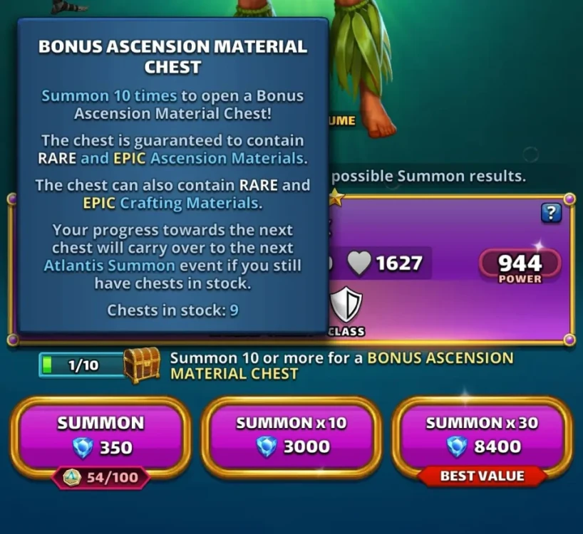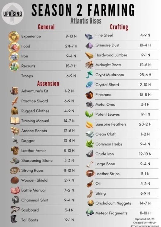 Season 2 : Atlantis Rises This thread is about Season 2 in reduced cost. The first occurrence appeared on February 2021 1. Event : Atlantis Rises (Reduced Cost) Core Rules: The basic functioning of the season (Stages, missions, etc.) remains the same as the original version. Find the base guide : Season 2: Atlantis Rewards: This season's usual rewards are improved and doubled. This event is very popular with players for farming and resources materials necessary for crafting items, basic resources or farming experience. New Feature: The main difference is the addition of "Dragon" monsters, which allow you to earn extra rewards when you complete the levels. 2. Access Conditions and Cost How to Access the Event Where to Find It: Access is via the Seasons Tab. Prerequisite: You must have completed up to stage 15 of season 1. Base Season: It is available permanently. Frequency (Summon Portal): It is part of a 4-day rotation among several seasons: S2 > S3 > S4 > S5 > UT1 > UT2 Energy Cost (Reduced) The levels in this event cost less World Energy than usual: Easy Mode: 3 to 7 energy. Hard Mode: 7 to 13 energy. 3. Specific Gameplay: Dragon What is a Dragon ? These are creatures that can appear randomly in levels. They grant extra rewards if you complete the level: Atlantis Coins Daily Clam Limit The quantity of Midgard Coins you can obtain is limited each day. Starting Cap: 15 clams per day. Increase: The limit increases by 15 each day up to a maximum of 60 clams per day. Monster Lure (Paid Option) The Monster Lure is an upgrade available through a special paid offer: It immediately increases your daily clam limit from 15 to 25 per day. It also increases the quantity of specific S3 pieces found in loot. 4. Atlantis Rises Summon Portal Summon Cost 1 Summon: Costs 350 Gems or 100 S2 Coins. 10 Summons: Cost 3000 Gems. 30 Summons: Cost 8400 Gems. Appearance Rate Presence of heroes from three groups: The heroes from Season 2. The heroes from Season 1 (but without costumes). A selection of old HOTM 5. Resources (Farming) Find the farming thread here: Reference Farming Infographics available by